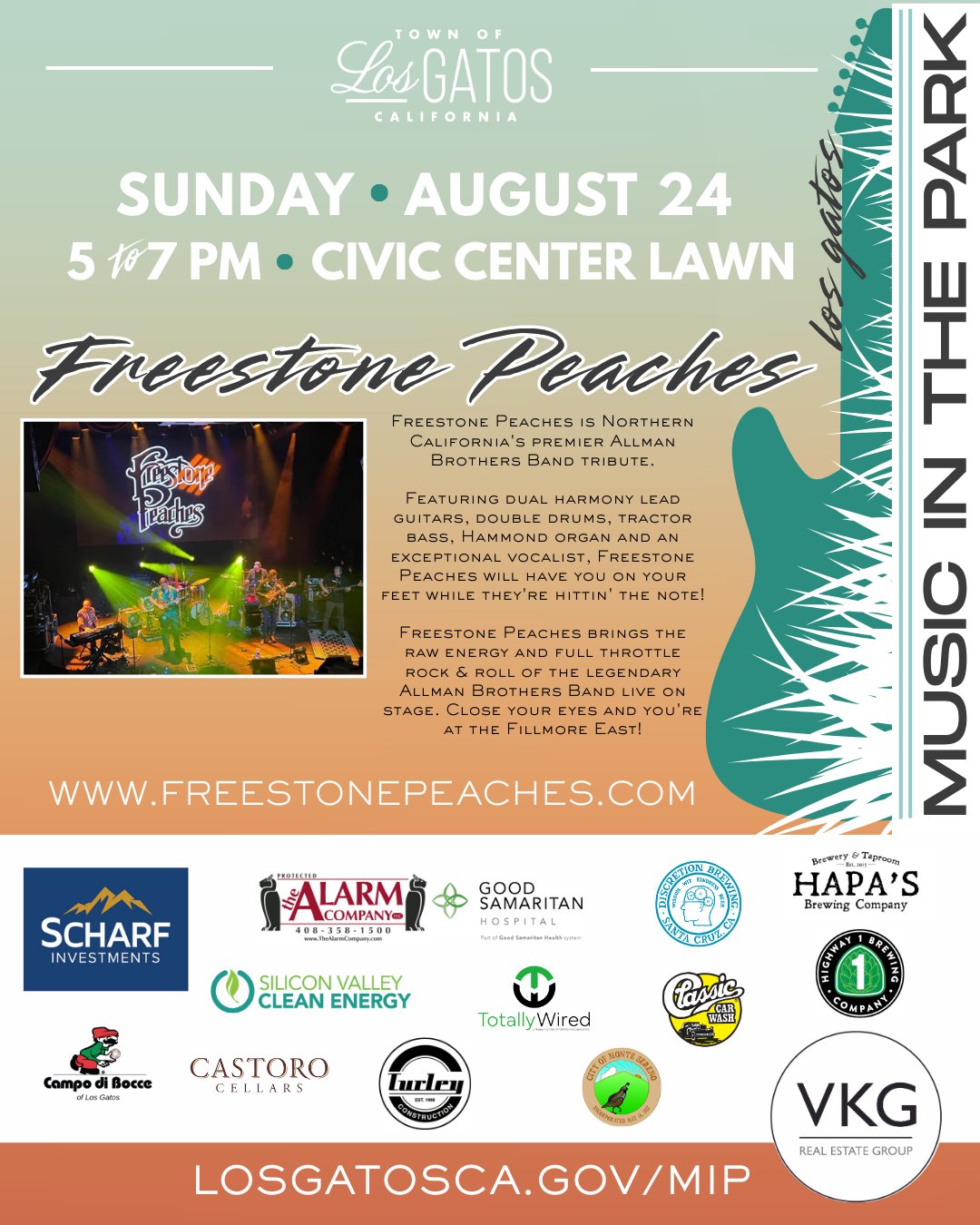 Los Gatos’ final Music in the Park event of the season will be on Sunday, August 24, from 5 to 7PM on the Civic Center Lawn at 110 E. Main Street with a performance by Freestone Peaches, Northern California’s premier Allman Brothers Band tribute.