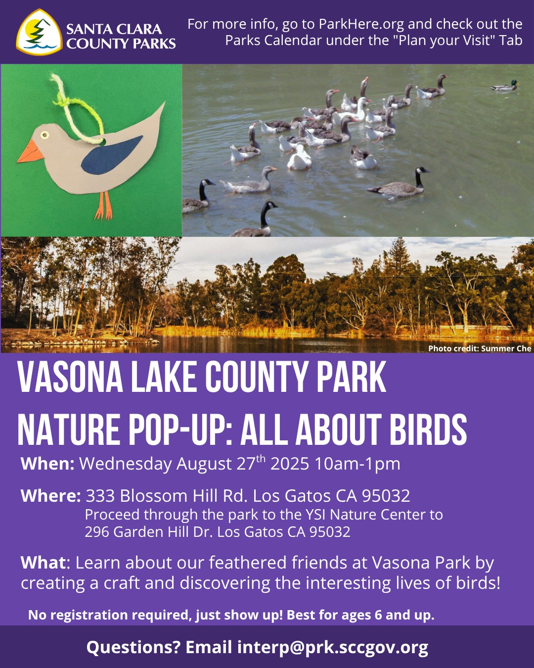 Celebrate the wonders of local wildlife with a drop-in bird craft activity at Vasona Lake County Park! Swing by the Youth Science Institute Nature Center at the northeastern end of the park between 10AM and 1PM to explore Santa Clara County’s native birds and create your own feathered masterpiece.