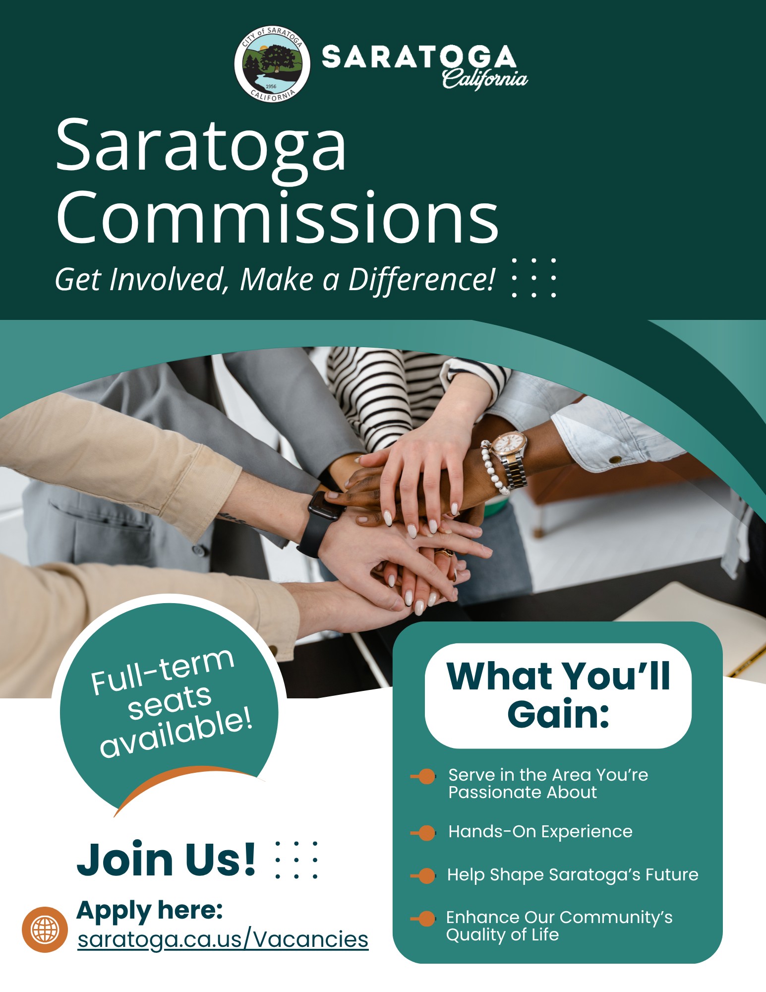 There’s one full-term seat available on the Heritage Preservation Commission, with applications due November 19, 2025. Be a champion of arts, culture, libraries, and core elements that add to Saratoga’s community’s quality of life.
