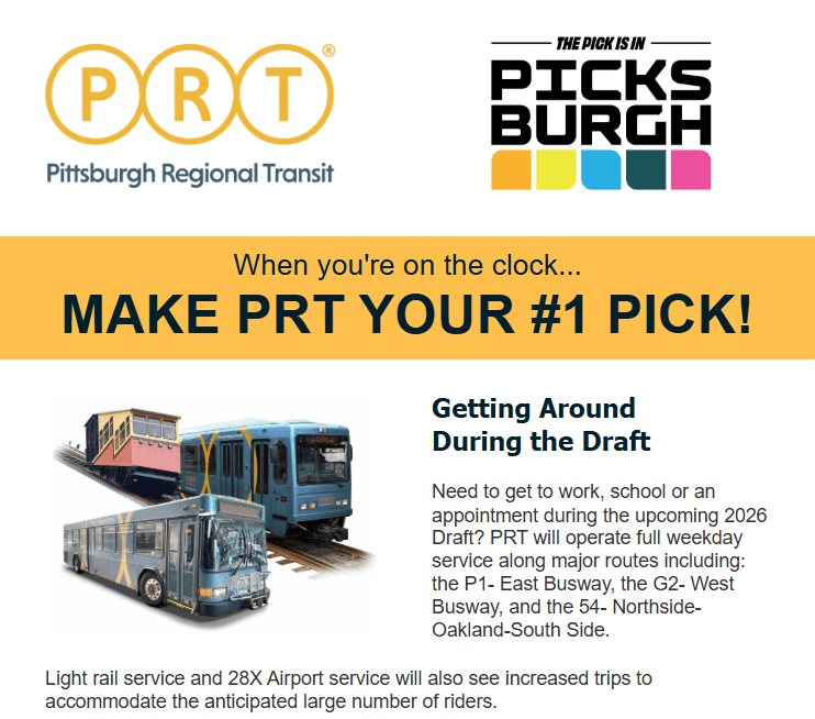 In case you haven’t heard – the NFL Draft will be here in Pittsburgh next week! While all events around the Draft are free, parking and traffic in North Shore and Downtown areas will be difficult. So, if you plan to attend Draft events, and I highly encourage you to check things out – especially on Saturday when Draft events are especially geared towards locals and families, make sure that you have a transportation plan. Check out special services during the Draft from Pittsburgh Regional Transit here. Do not drive.