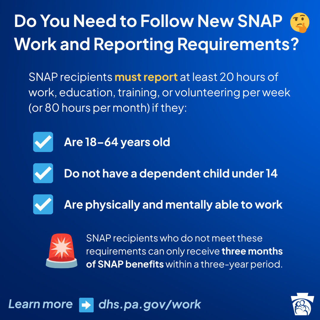 If SNAP-eligible individuals meet these requirements but do not report that information to the Pennsylvania Department of Human Services (PA DHS), they will lose SNAP benefits. Loss of SNAP benefits could also lead to the loss of other benefits for which individuals are automatically eligible by being SNAP recipients.