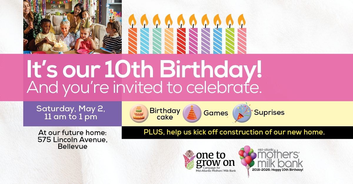 Join Mid-Atlantic Mothers’ Milk Bank at their future home in Bellevue to celebrate ten years! Get all the details here.