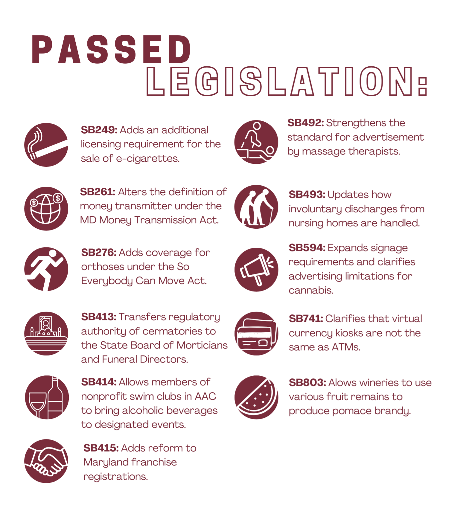 SB415: Business Regulation - Maryland Franchise Registration and Disclosure Law - Alterations (Franchise Reform Act) codifies the Maryland Franchise Disclosure Document Renewal Fast-Track Review Pilot Program, which was put in place last year by the security commissioner. This bill implements a process that rivals our neighboring states in efficiency and allows more Marylanders to pursue business ownership through franchising.
