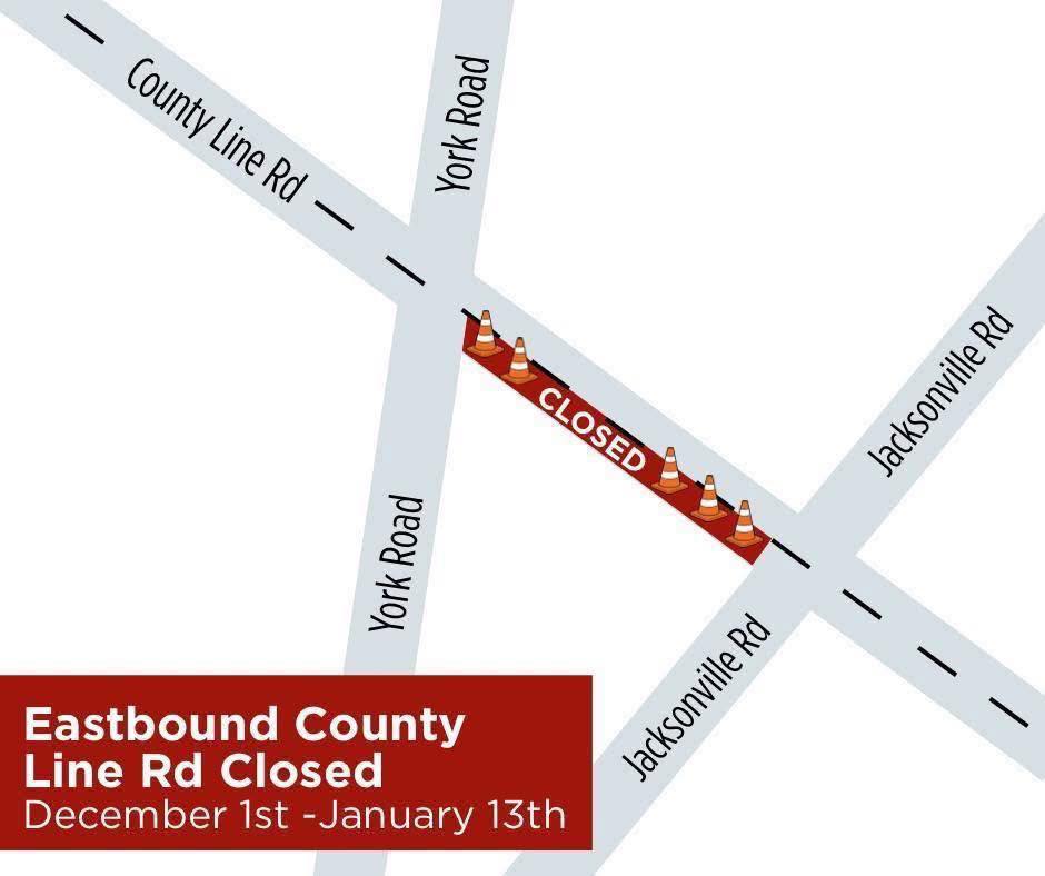 - The westbound lanes of County Line Road will remain open during this work. Only eastbound traffic is impacted by this closure.