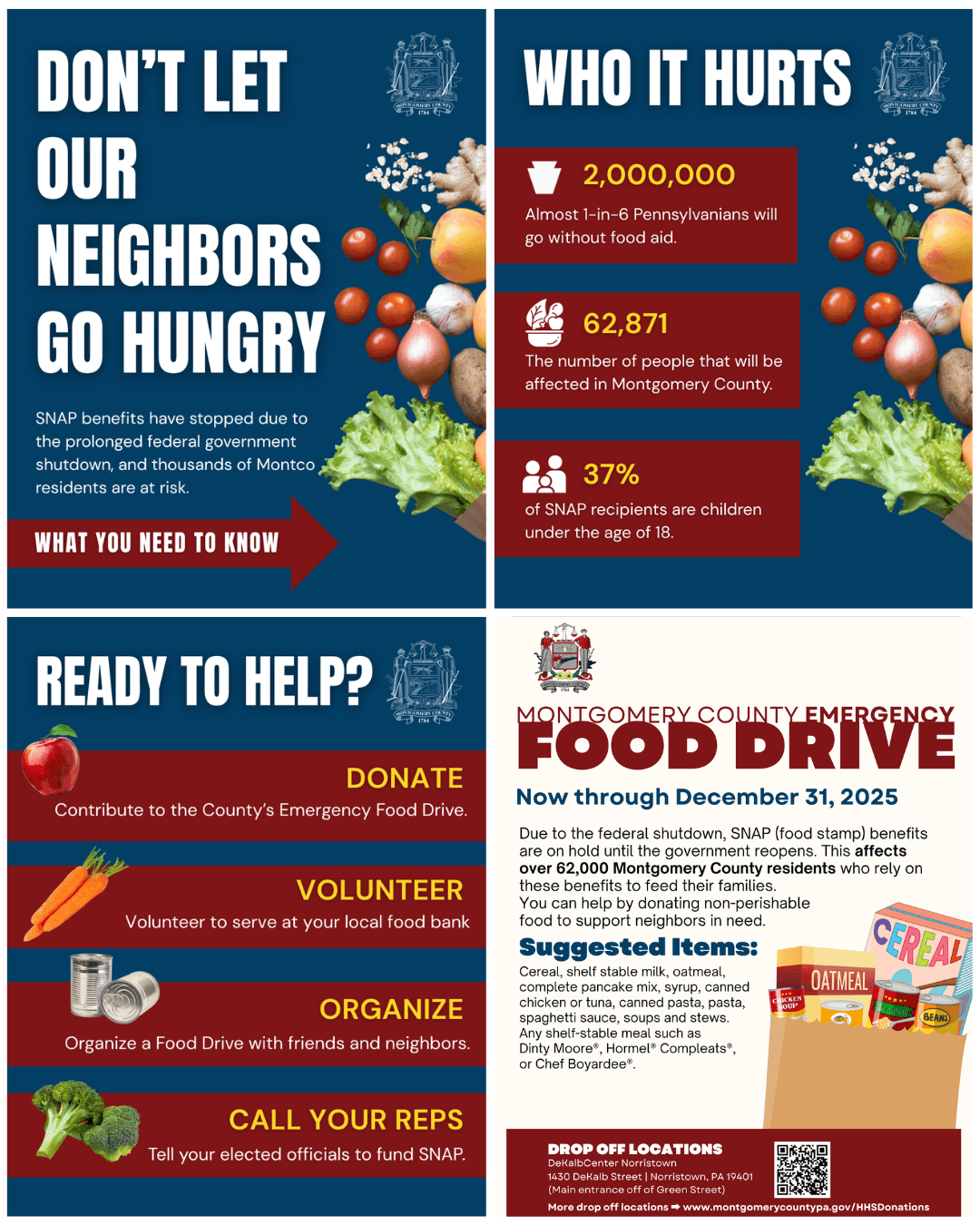 Montgomery County has launched a website for those who need support and those who have the resources to help their community. Visit SNAP Funding Paused | Montgomery County, PA - Official Website for more information.