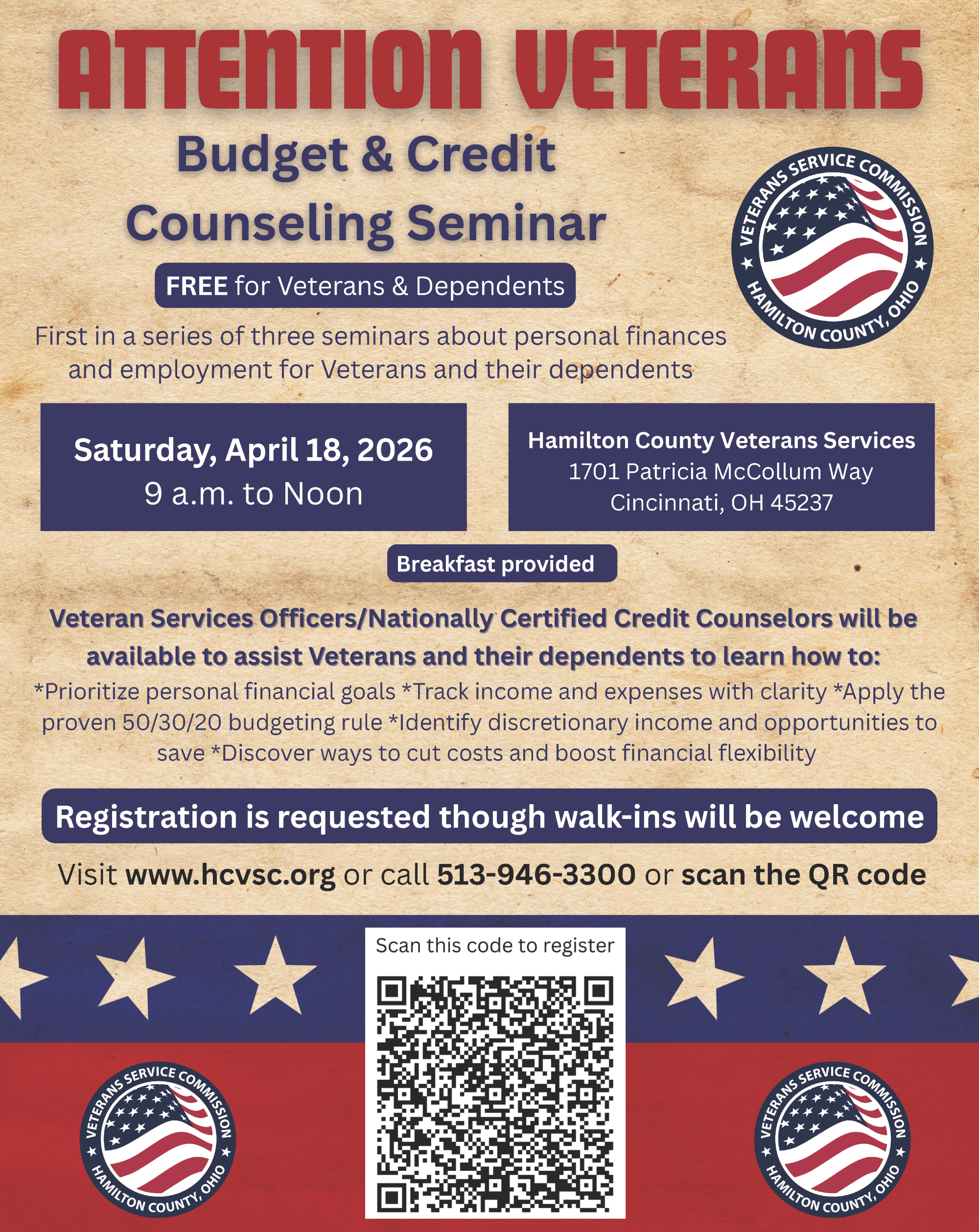 Beginning April 2026, Hamilton County Veterans Services (HCVSC) will host and facilitate a FREE monthly series of personal finance and employment readiness seminars at its new location. The first seminar will focus on Budget and Credit Counseling and will be held on Saturday, April 18, from 9 a.m. to Noon.