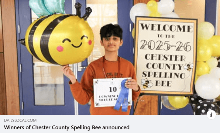 It’s wonderful to see two students from our community bee among the top spellers in the county. Their curiosity, preparation, and love of learning are inspiring examples for students across Central Chester County.