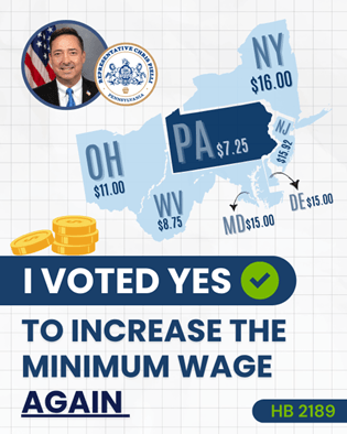 Last week, I voted YES to increase Pennsylvania's minimum wage - to $11/hour in 2027; $13/hour in 2028; and $15/hour in 2029, in addition to having a COLA increase tied into the inflation index thereafter.