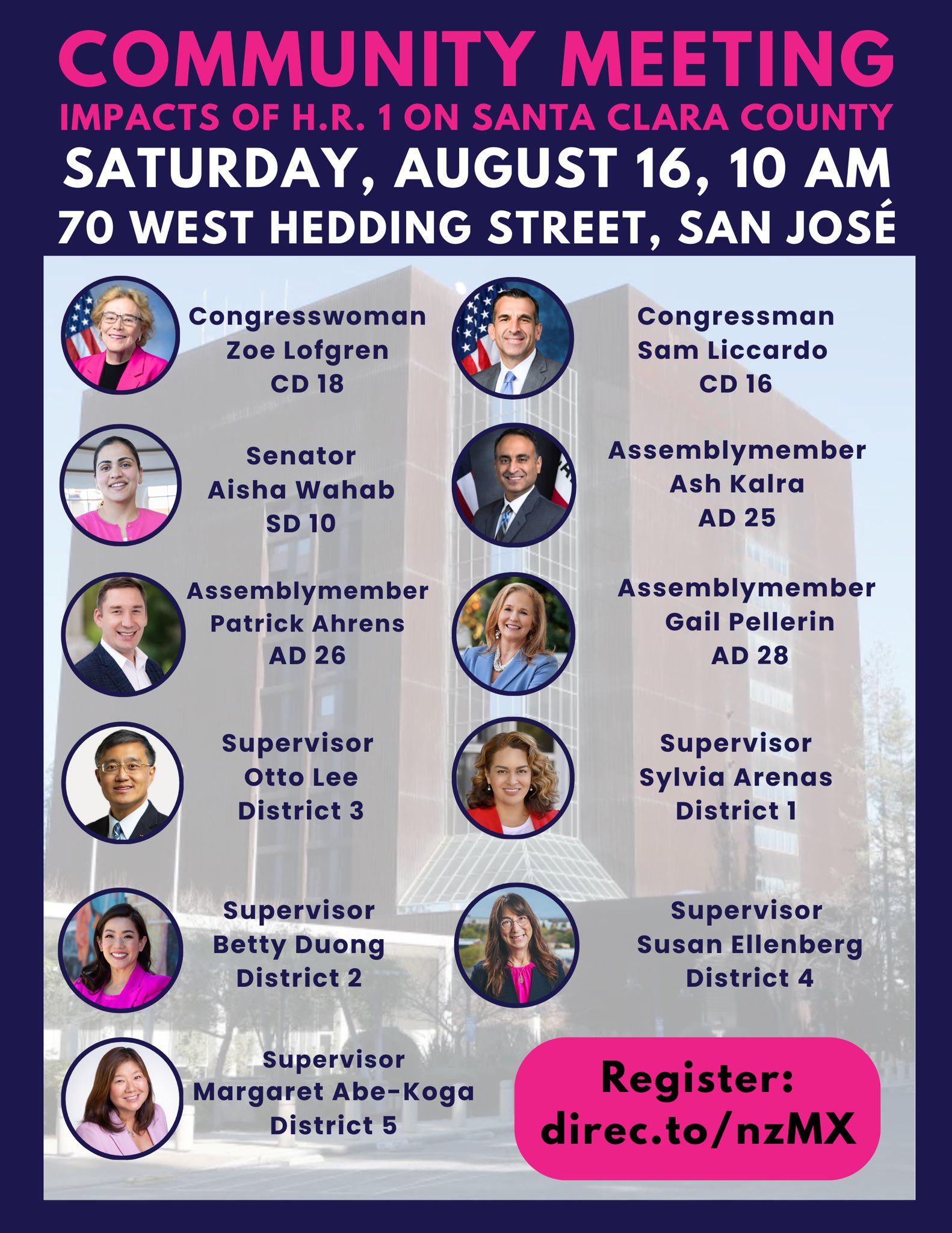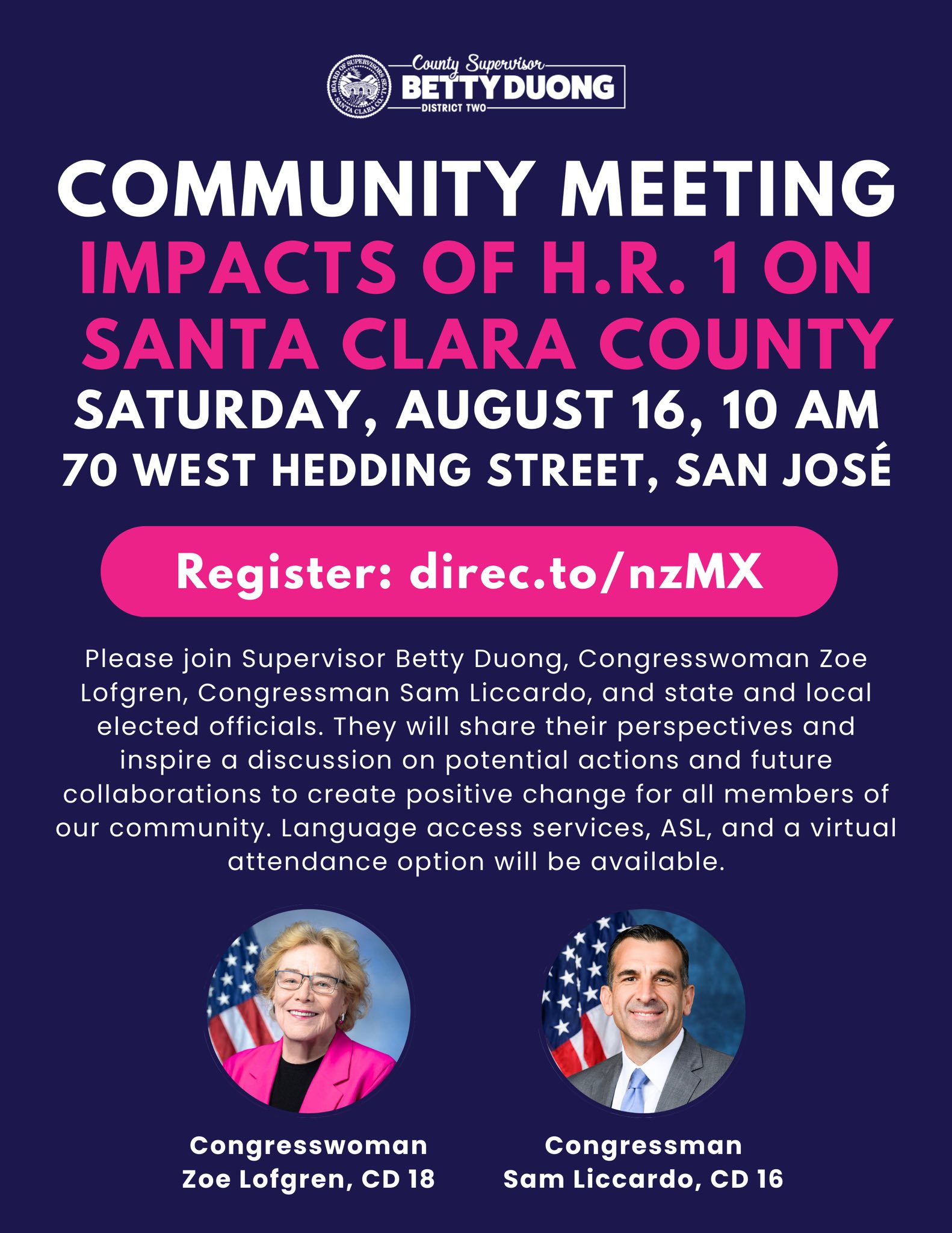 Setting aside funds in reserve for unforeseen developments -- and doing so by policy will help ensure we are better prepared for future challenges. Our County must take proactive steps to avoid being in a difficult position again. That’s why open dialogue with our community is so important. You are invited to a community meeting on Saturday, August 16 from 10AM to 1PM at the County of Santa Clara Government Center, located at 70 West Hedding Street, San José. You will hear directly from federal, state, and county leaders about the projected $1 billion loss in federal funding to Santa Clara County under H.R. 1. This is an opportunity to learn how these changes could affect local services and your neighborhood, ask questions, and share your concerns.