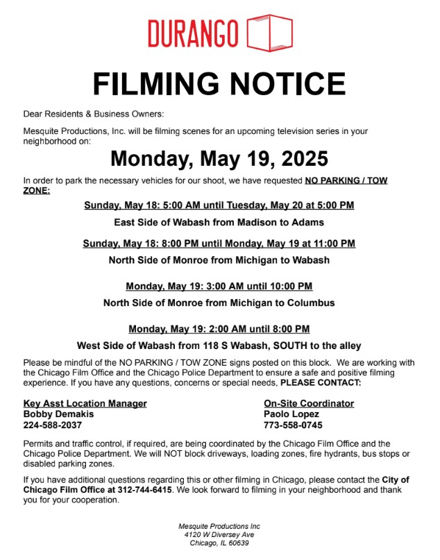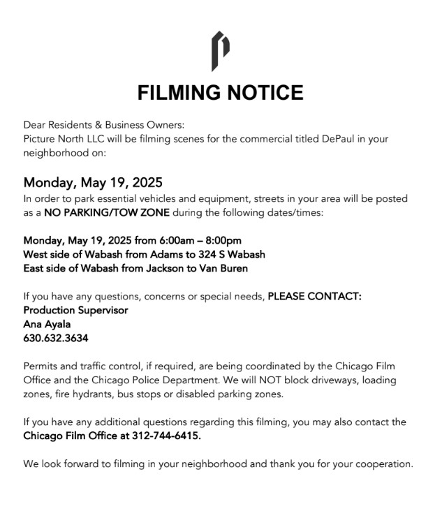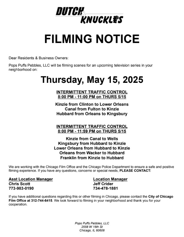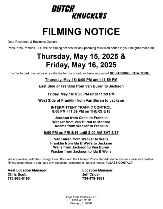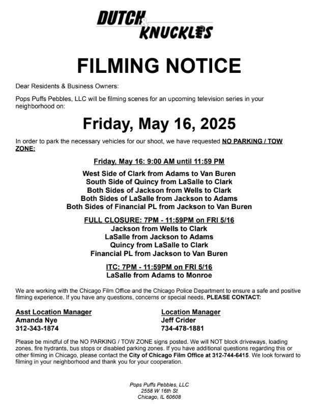 - Polk Street from LaSalle to Clark will be closed 9am-4pm on May 15th.