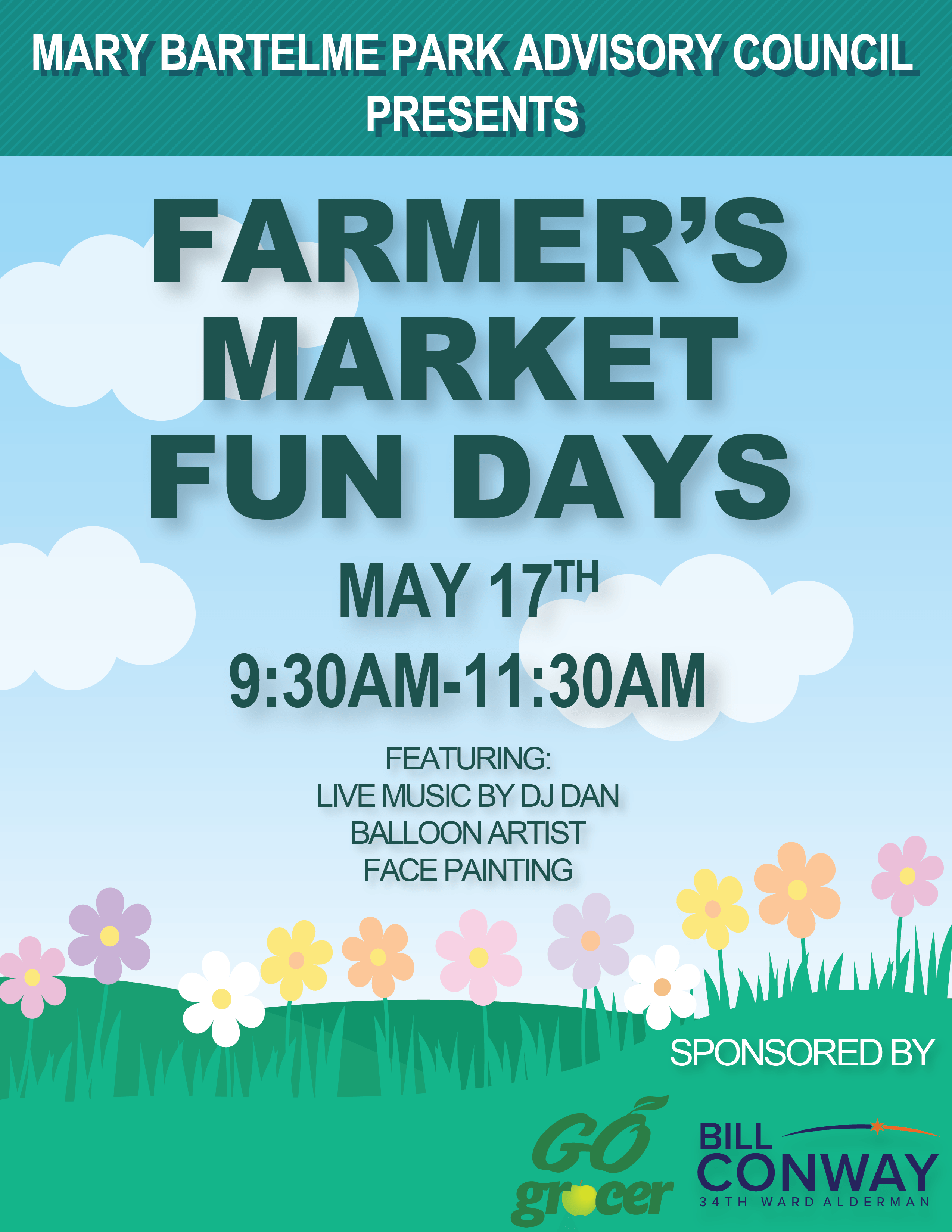 The Mary Bartelme Park Advisory Council is hosting a Farmers Market Fun Day this Saturday with music, a balloon artist, and face painting! This will be in the park from 9:30-11:30.