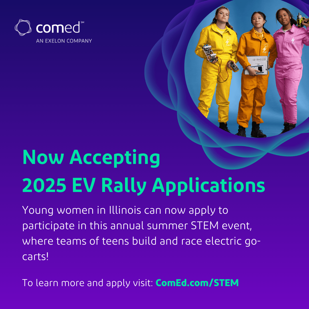ComEd is excited to announce the return of its signature summer program for young women, the ComEd EV Rally. Young women from across northern Illinois can now apply to participate in this summer event, a competition that challenges 45 teen girls to build and race high-tech, electric-powered go-carts.