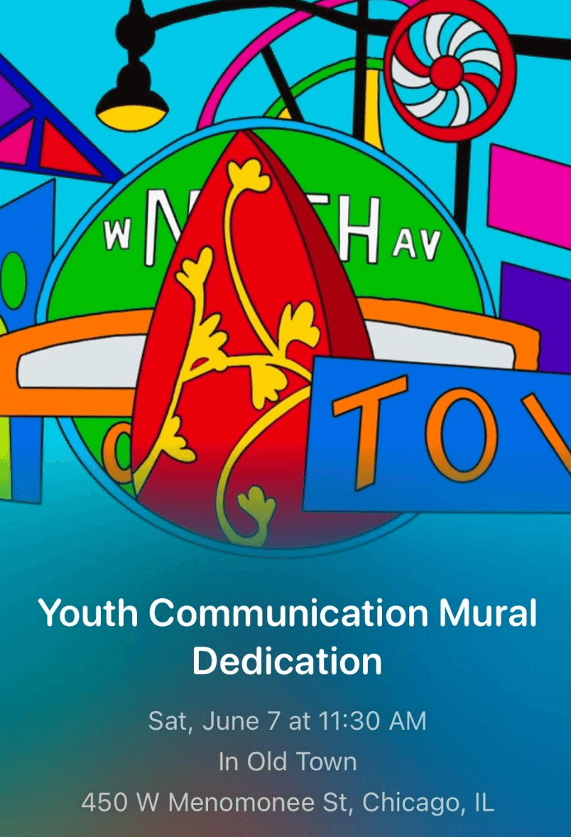 The Youth Communication Mural unveiling on Saturday, June 7th at 11:30am at 450 W. Menomonee. The mural, created by Arturo Barrera, represents the iconic images of the beautiful Old Town neighborhood. The Chicago Sifonietta has volunteered to join us for the opening with the wonderful sounds of their String Quartet. Mr. Arturo Barrera, Art Instructor, and his students who traveled from Pasteur Elementary school on Saturday mornings to paint the mural will also be in attendance. A dedication plaque will be affixed to the mural and will display the names of Artists, youth artists and those who sponsored this great mural.