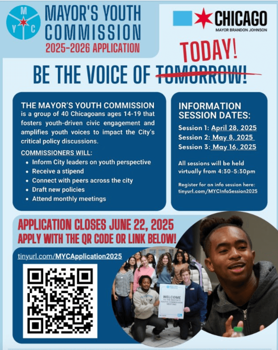 The Mayor’s Youth Commission is a City of Chicago formal advisory body of up to 40 Chicagoans between the ages 14 and 19 who are passionate about issues that impact youth. These commissioners advise the Mayor and City leaders, represent their peers and communities, and learn about policy and projects within the City of Chicago. The Youth Commissioners meet on a monthly basis to collaborate and positively impact Chicago’s future. Commissioners are paid a yearly stipend for their work. The 2024-2025 Youth Commission New Ideas Booklet will be launching in May 2025. Looking to get more information about the program and how to fill out a quality application? Click here and enter the password: r8NP4!kX