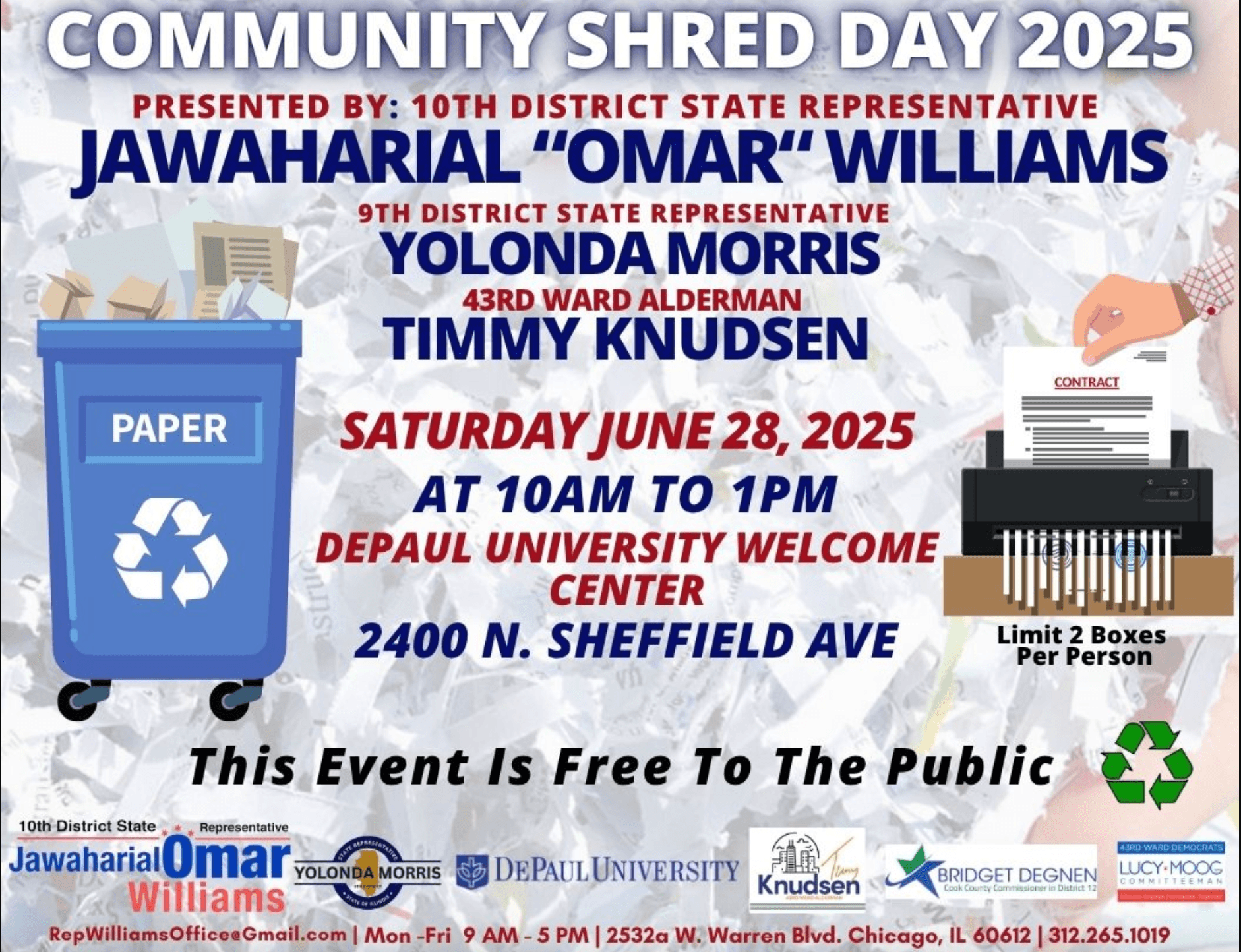 Our office is proud to partner with State Rep. Omar Williams for a Shred Event on June 28th from 10am to 1pm.