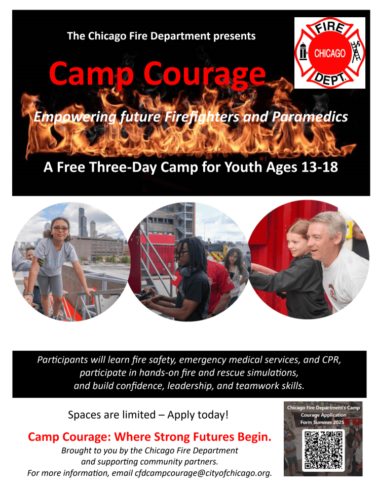 The Chicago Fire Department is proud to announce the return of Camp Courage, a three-day summer camp program running June 23 – July 30, 2025, at six locations across the city. This exciting initiative offers young participants a unique opportunity to explore careers in firefighting and emergency medical services (EMS) through engaging, hands-on activities including: