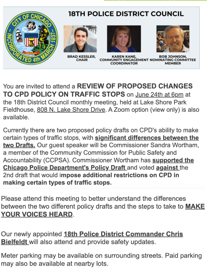 We work closely with the 43rd Ward’s local CAPS districts, which include the 18th (Near North) and 19th (Town Hall) Police Districts. Our office is in frequent contact with officers from both of these districts and their local CAPS officers, who host a variety of community forums and events including beat meetings, informational settings, and expert panel discussions, as well as sending out community alerts when a pattern of crime is detected.