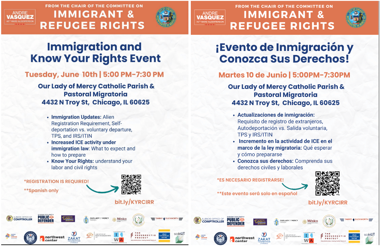 The City of Chicago Committee on Immigrant and Refugee Rights along with the Consulate General of Mexico, the Consulate General of Guatemala, the Cook County Public Defenders, Attorney Rocio Velazquez Kato, and other community organizations, are organizing this immigration information session. During this event, we will be sure to provide you with immigration updates like Alien Registration Requirement, Self-Deportation vs. Voluntary Departure, TPS and IRS/ITIN, Increased ICE activity under immigration law: What to expect and how to prepare, and understanding your rights regardless of your immigration status in this country. When: Tuesday, June 10th, 5 PM - 7:30 PM Where: Our Lady of Mercy Catholic Parish, 4432 N Troy St, Chicago, IL 60625 *On-site registration required and this event will be in Spanish only. Register Here.