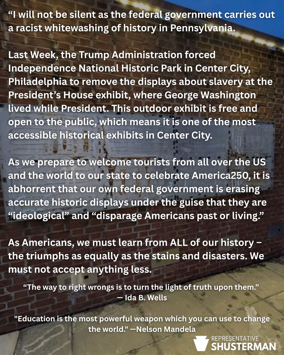 Even in these dark days, I am looking for the light of a brighter future. We are strongest together. I encourage you to seek out stronger connections with your neighbors and our community-based organizations. I will continue to work with my colleagues in the PA House to advocate for our neighbors, our communities and to protect our civil liberties.
