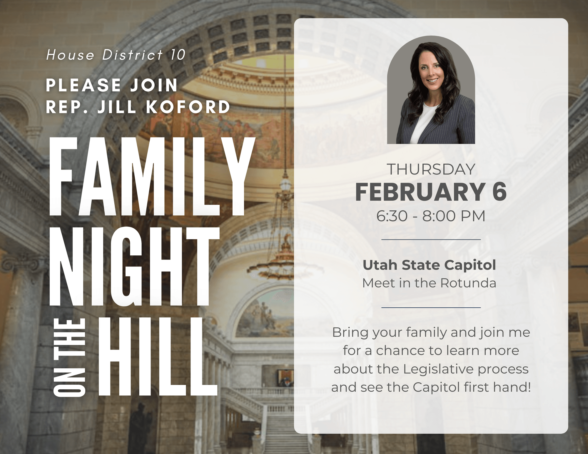 I’m excited to invite you to join me for Family Night on the Hill on February 6th from 6:30 - 8:30 PM at the Utah State Capitol! This is a great opportunity to meet with me, share your thoughts, and tour our beautiful state capitol building. Bring your family, enjoy the evening, and let’s connect about the issues that matter most to you. I can’t wait to see you there!