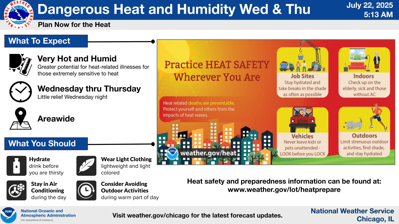 IMPACTS: Heat related illnesses increase significantly during extreme heat and high humidity events. Heat indices late Wednesday night is not likely to drop much below 90 degrees, particularly in the city. Therefore, little to no heat relief is expected until sometime Thursday night. Residents are advised to drink plenty of fluids, stay in an air-conditioned room, stay out of the sun, and check up on relatives and neighbors. For cooling areas, visit Cooling Centers - Map | City of Chicago | Data Portal. Residents can also contact 3-1-1 for the nearest location and hours. For additional guidance and information: CDPH guidance for heat related illness.