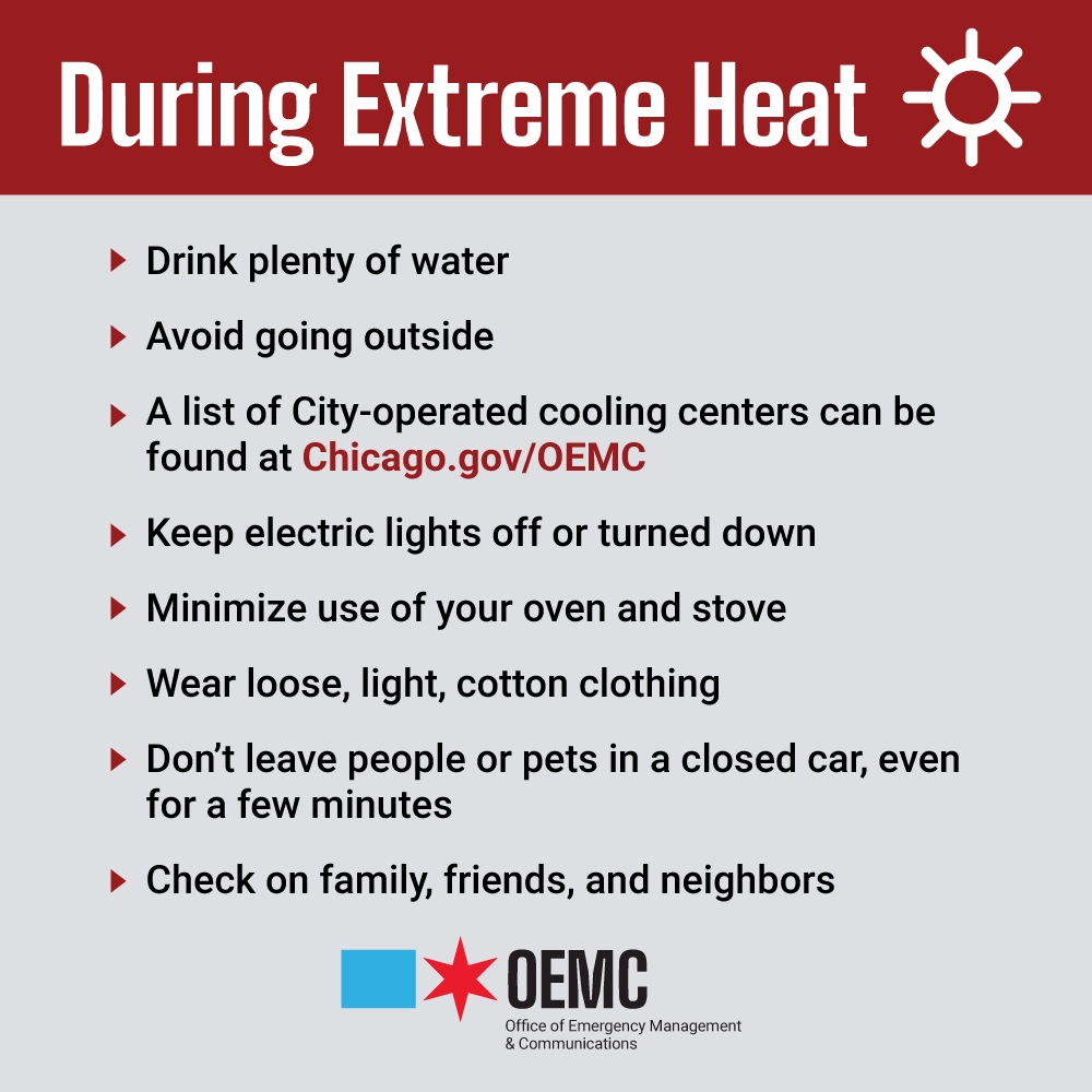 For safety and preparedness at your fingertips, residents and visitors are encouraged to download the Chicago OEMC App. The public safety tool provides safety information, cooling center locations, preparedness tips, emergency alerts, weather information and much more. Users will also have access to current forecasts, radar, and other weather-related information as well. The app is available through the Apple App and Google Play stores or visit the website Chicago.gov/OEMC.