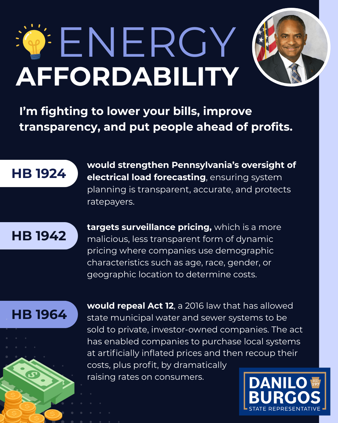 In Harrisburg, I’m fighting to lower your bills, improve transparency, and put people ahead of profits. I’ve introduced three bills in the House that prioritize affordability and consumer protection: