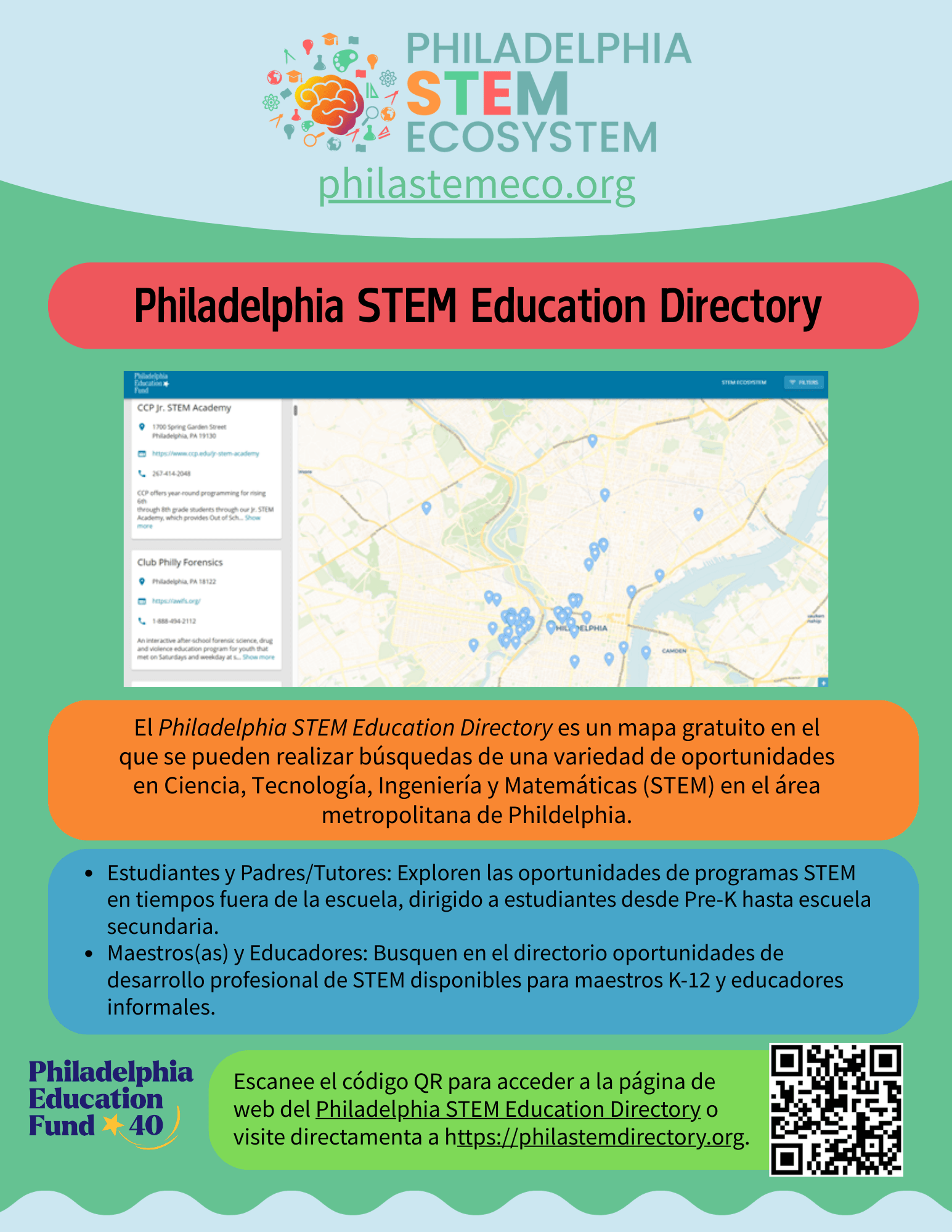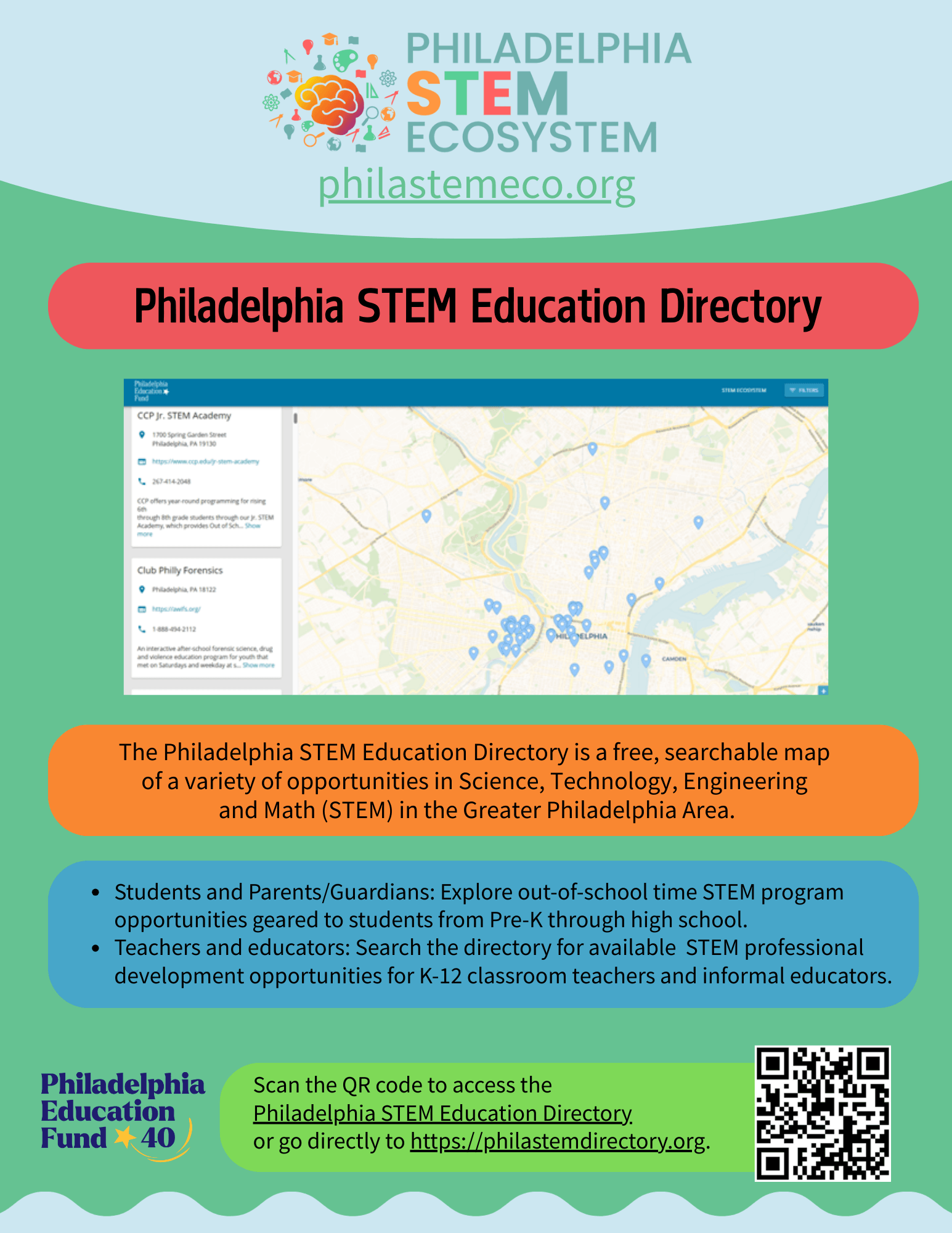 The Philadelphia STEM Education Directory is a free, searchable map containing a variety of in-person STEM opportunities in the Philadelphia area, including out-of-school time for students in pre-K through high school, as well as professional development opportunities for classroom teachers and informal educators.
