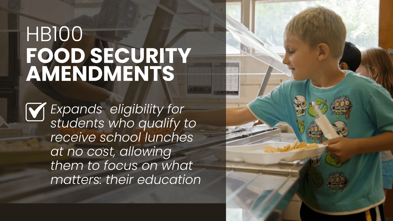 HB100 Food Security Amendments takes an important step toward ensuring that no child in Utah goes without a nutritious meal. This bill establishes a program to provide lunch at no cost to eligible students, helping families facing food insecurity and ensuring that children have the nourishment they need to succeed in school. By investing in our students’ well-being, we are strengthening Utah’s future and supporting families across the state.