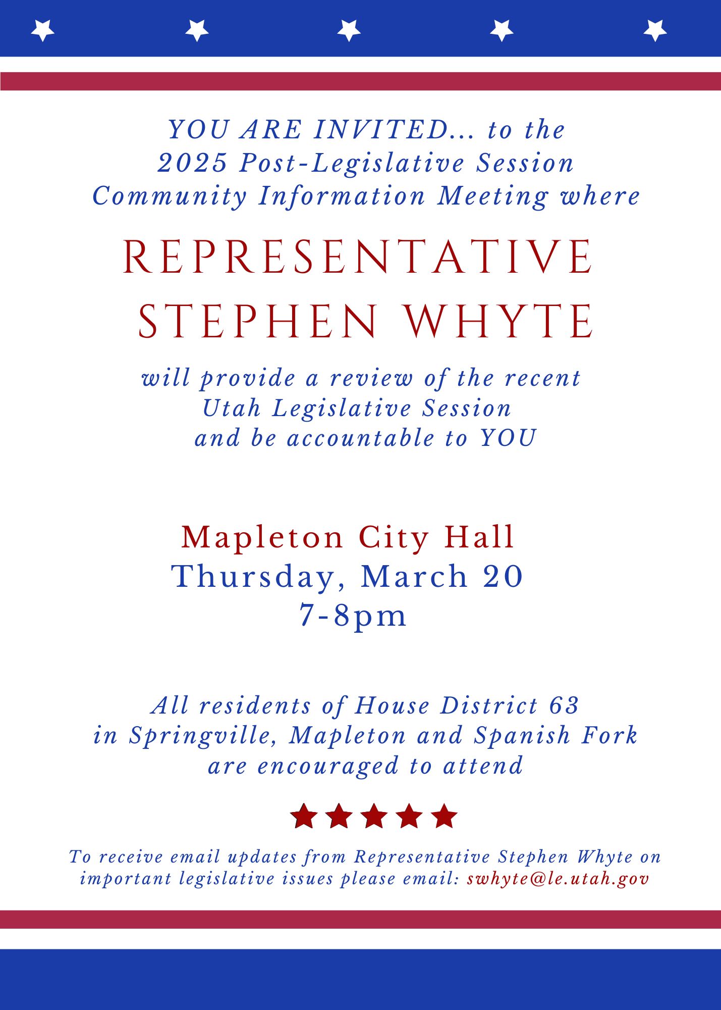 You are invited to my post-legislative session community information meeting where I will provide a review of the session and be accountable to you. I’m looking forward to being with you.