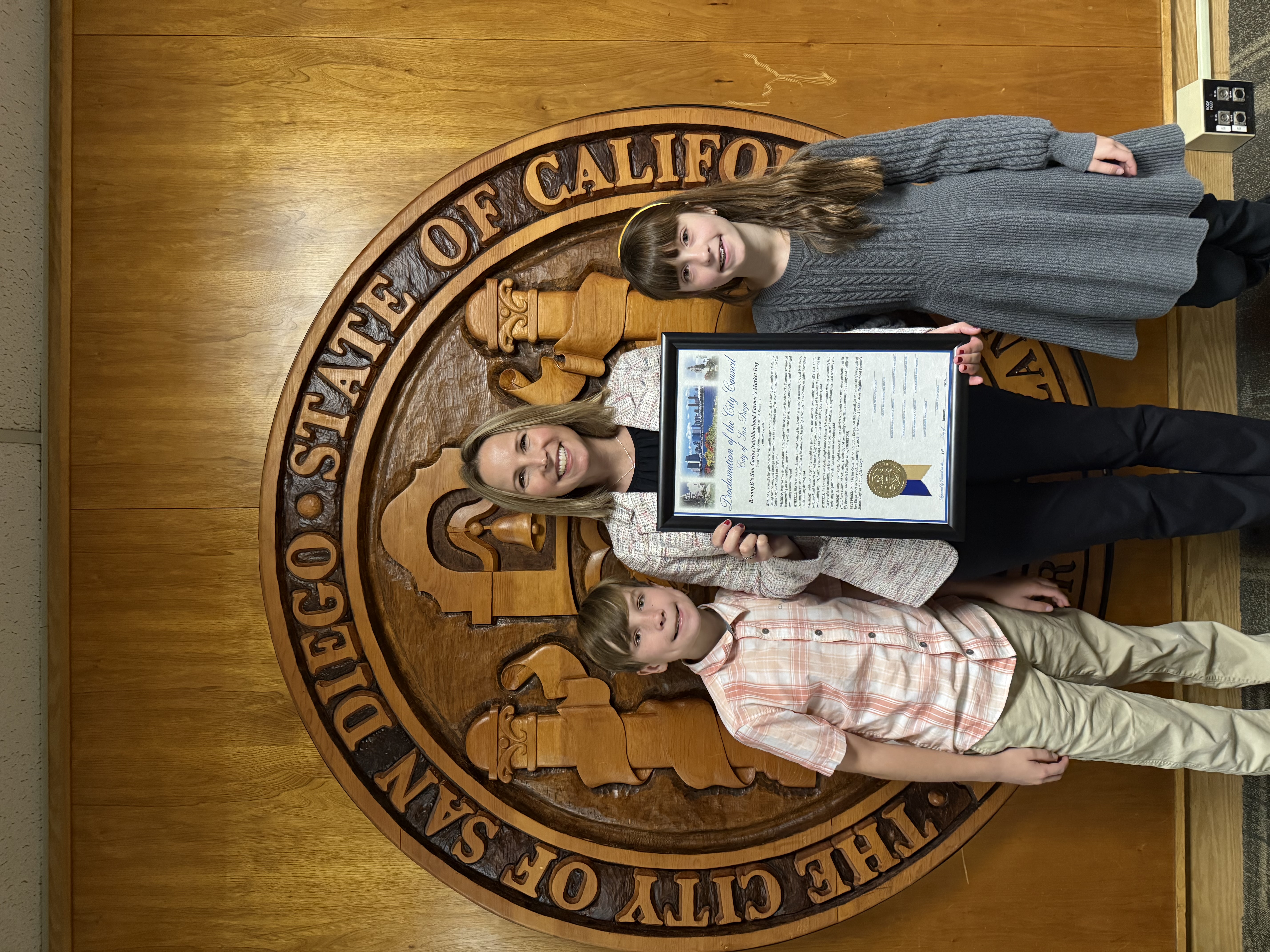 I led a proclamation declaring January 25, 2026 as “Bronny B’s San Carlos Neighborhood Farmer’s Market Day” in the City of San Diego. I invited Becky, her husband Doug, and their children Jude and Lily to chambers to accept the proclamation.