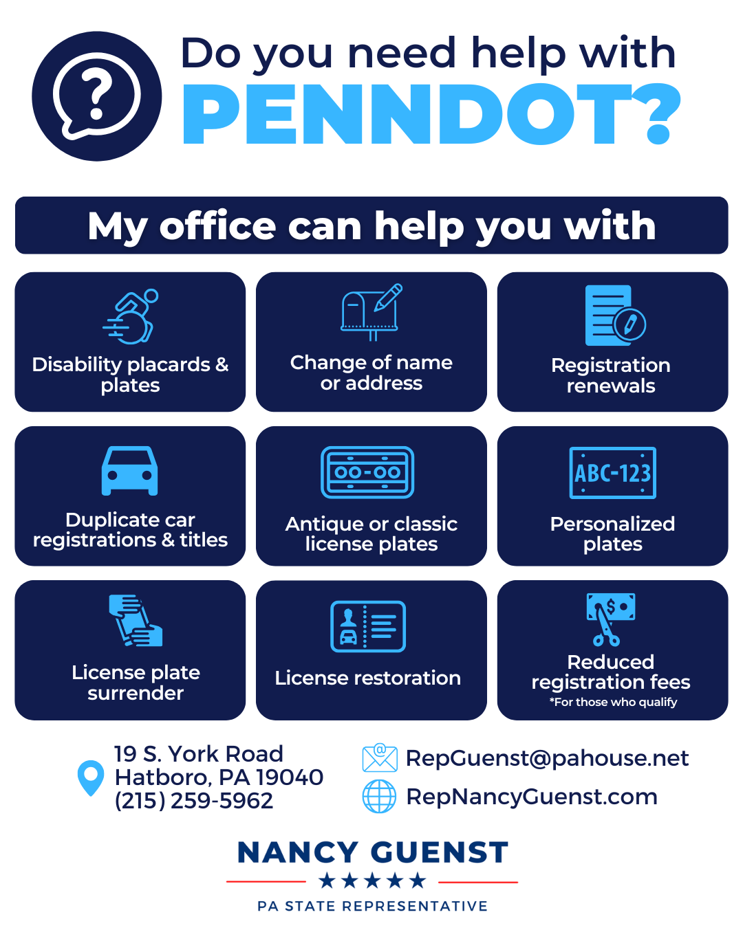 One of our most requested services is helping people navigate services and issues with PennDOT. From renewing your vehicle registration to applying for a disability placard or plate, our office can assist you with several PennDOT services. Check out the graphic below for services we can help with. If you have an issue or need assistance, please stop by or give our office a call. We are happy to help!