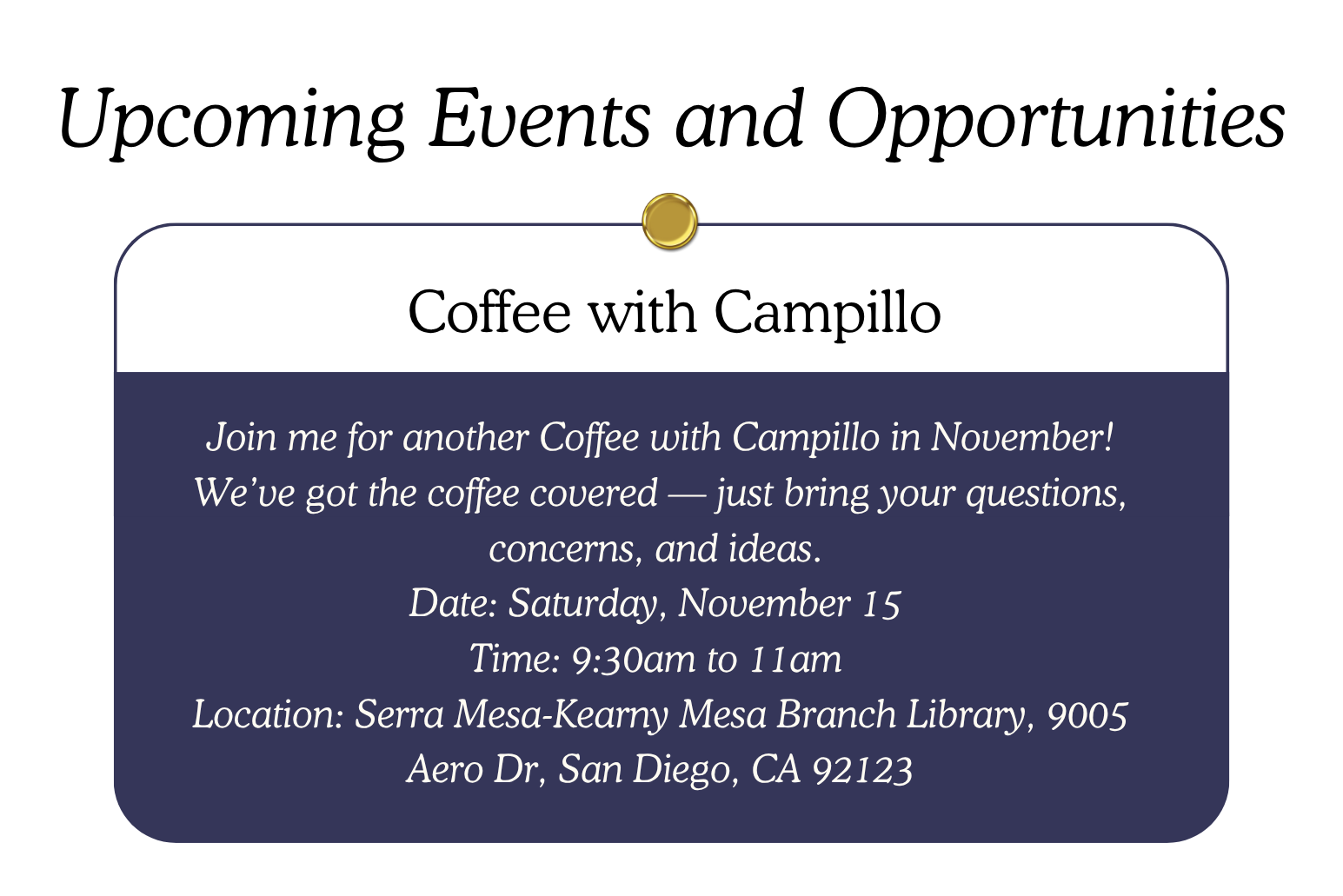 This month, I plan to meet with PATH—the non-profit organization we task with homelessness outreach in the City of San Diego—to discuss their progress in mitigating unsafe camping and their success connecting people experiencing homelessness to health, housing, and economic resources. PATH’s work is absolutely invaluable, and I am deeply grateful for their efforts to build a safer San Diego.