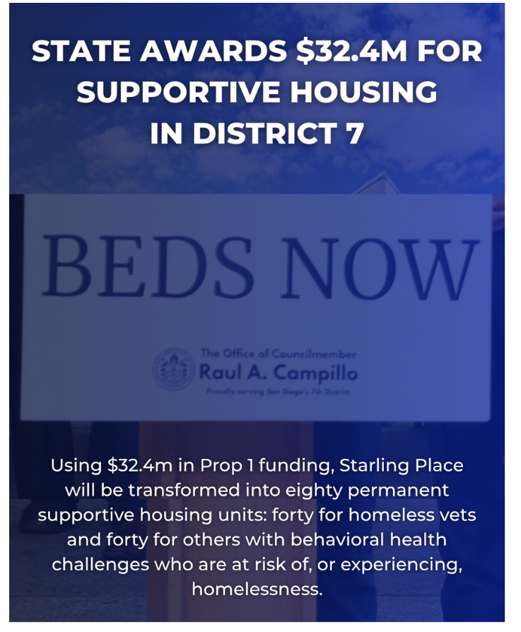 The City Council recently voted to accept $32.4 million from the State for Starling Place, a project to convert short-term vacation rentals into permanent supportive housing in Serra Mesa. Of the eighty units that will be coming online, forty will be reserved for veterans experiencing homelessness and the other forty will be for San Diegans in general with behavioral health challenges who are at risk of, or currently experiencing homelessness.
