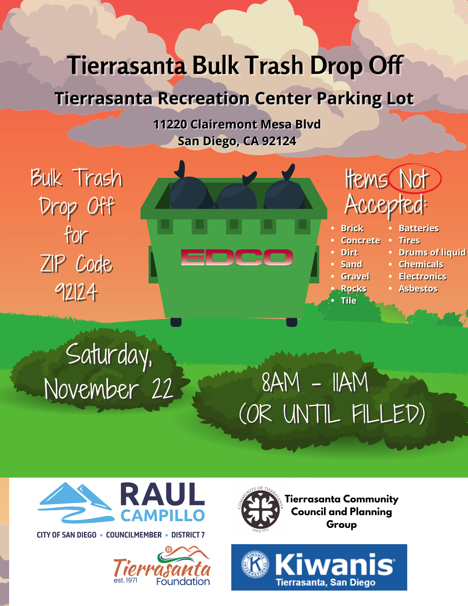 Mark your calendars for Saturday, November 22nd from 8:00 AM to 11:00 AM, or until the dumpsters are full, at the Tierrasanta Recreation Center Parking Lot (11220 Clairemont Mesa Blvd, San Diego, CA 92124). Please note that the following items will not be accepted:
