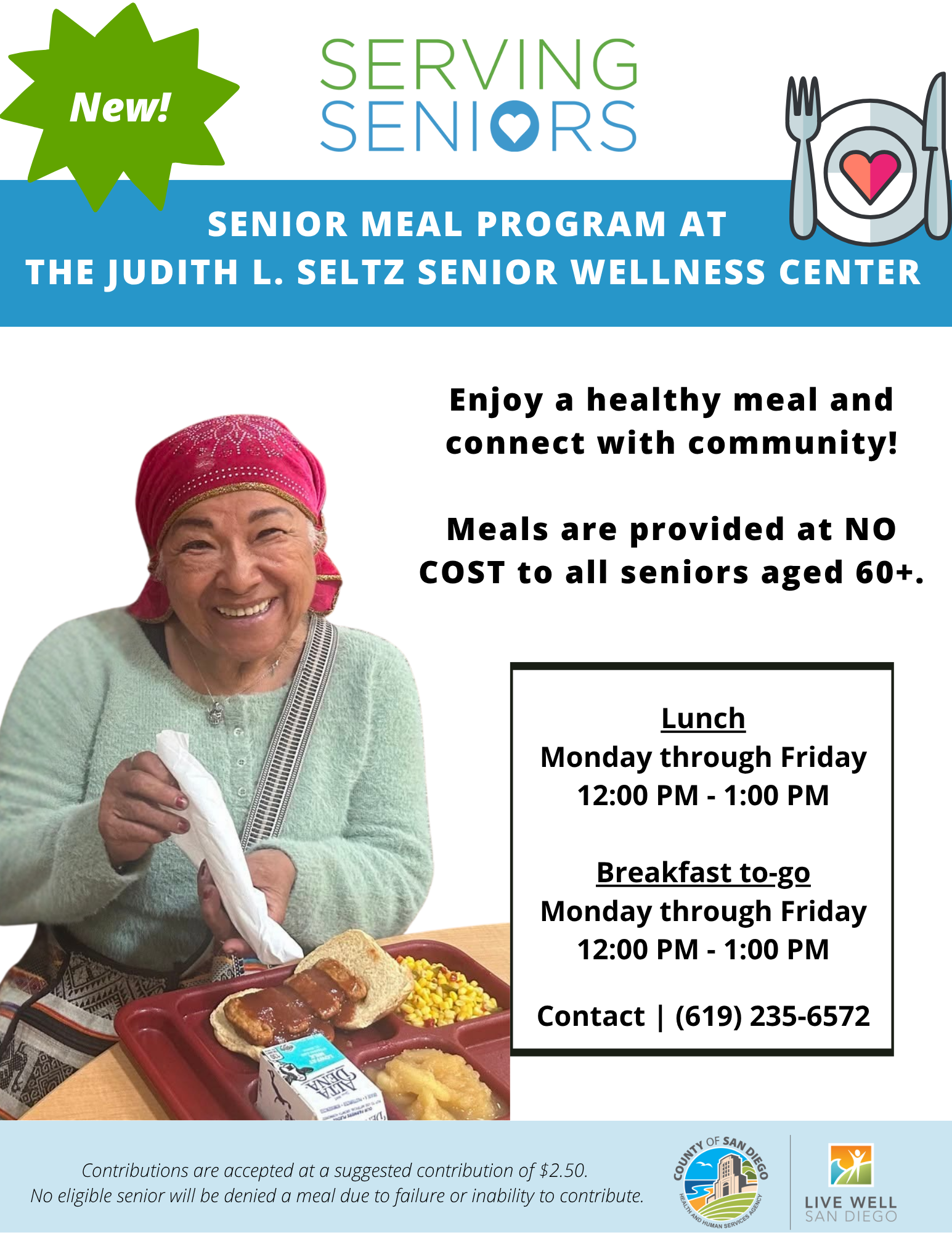 In partnership with the County of San Diego's Age Well Services, Serving Seniors is now offering a new senior meal program at the Judith L. Seltz Senior Wellness Center, located within the Paul Downey Senior Apartments in Clairemont. Free meals will be provided to all seniors age 60 and above - not just residents of the apartments - Monday through Friday for lunch between 12pm and 1pm. Takeaway breakfast will also be provided during this time. For more information, or if you have any questions, please call Serving Seniors at (619) 235-6572.