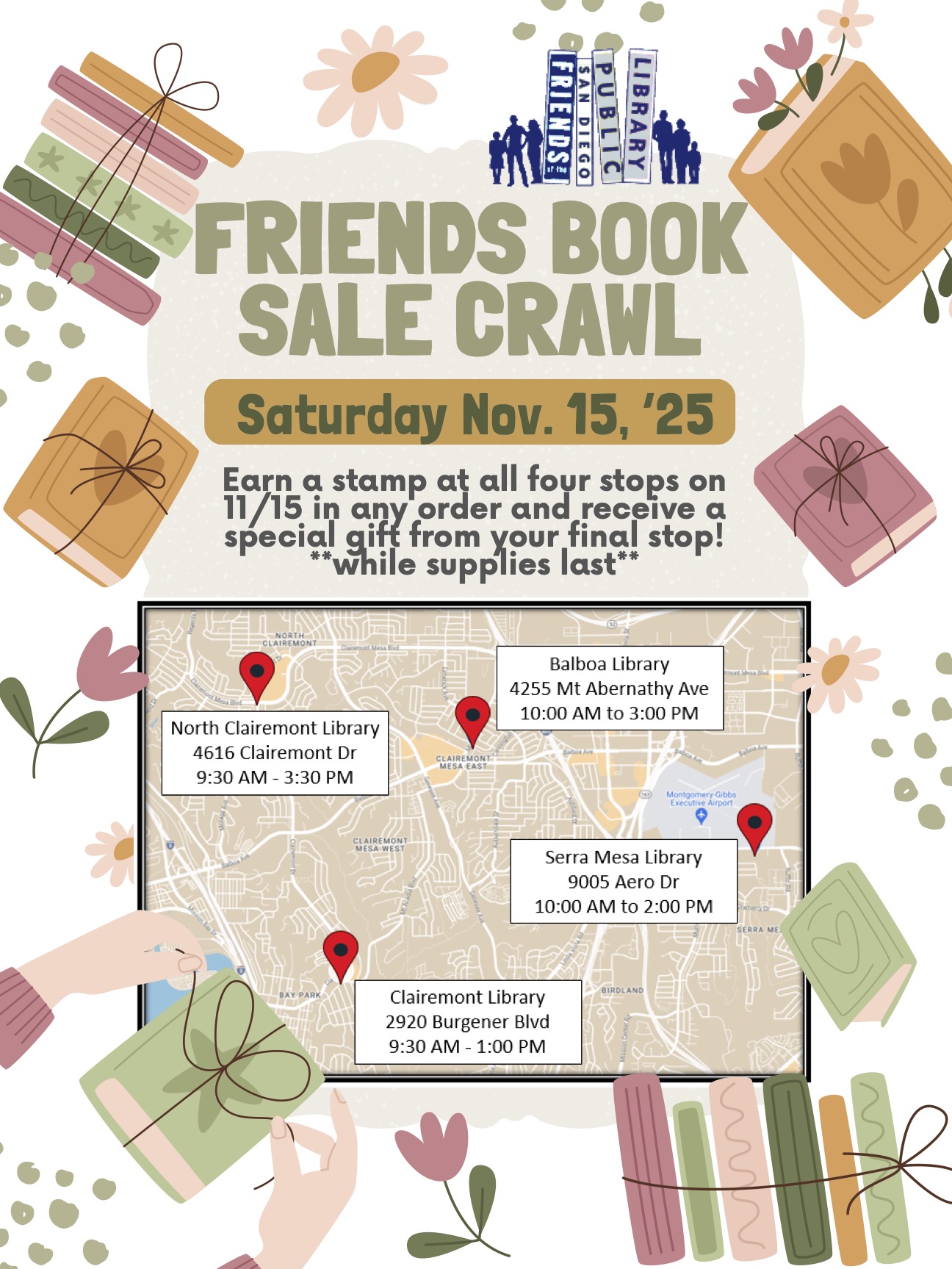 On Saturday, November 15 the Friends of the San Diego Public Library are hosting a book sale crawl where visitors who make a purchase at each of the four libraries included in the crawl can win a special gift. The participating libraries include the three Clairemont libraries and the Serra Mesa Library in District 7.