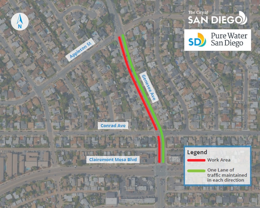 Beginning November 10, crews started installing underground pipes on Genesee Ave. between Clairemont Mesa Blvd. and Appleton St. To maintain the safety of the community during this phase of work, new traffic control will be installed. The southbound side of Genesee Ave. will be closed to through vehicle traffic for approximately three weeks, but local access will be maintained for residents, and one lane in either direction is currently maintained on the northbound side of Genesee Ave. Once the first phase of work is complete, crews will transition this traffic control to the northbound side of Genesee Ave. Crews will be performing work from 7am to 3pm Monday through Friday, for approximately eight weeks. This schedule is subject to change. Every street where pipeline is installed will be fully repaved curb to curb and re-striped. For your safety, please follow all posted signage.