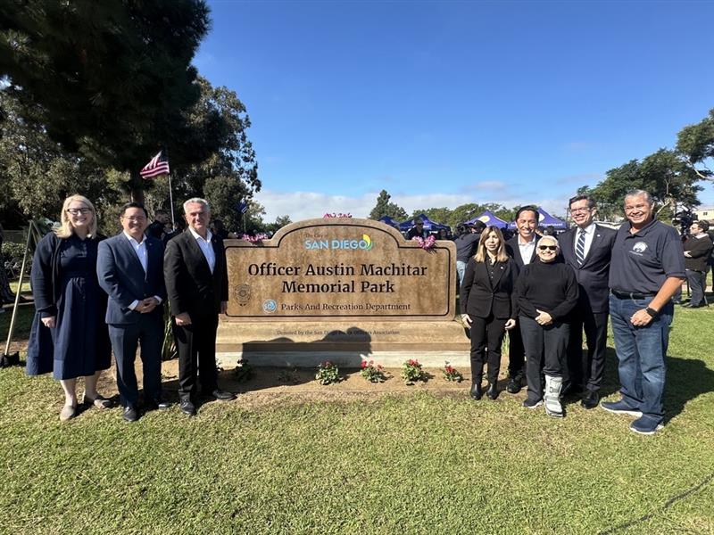 Earlier this month, the official "Officer Austin Machitar Memorial Park" sign was revealed, officially renaming the North Clairemont Community Park in his honor. Officer Machitar is a community hero who gave his life protecting San Diego. His legacy and heroism will live on for generations. His family, colleagues, and the San Diego Police Foundation were instrumental in making this tribute possible.