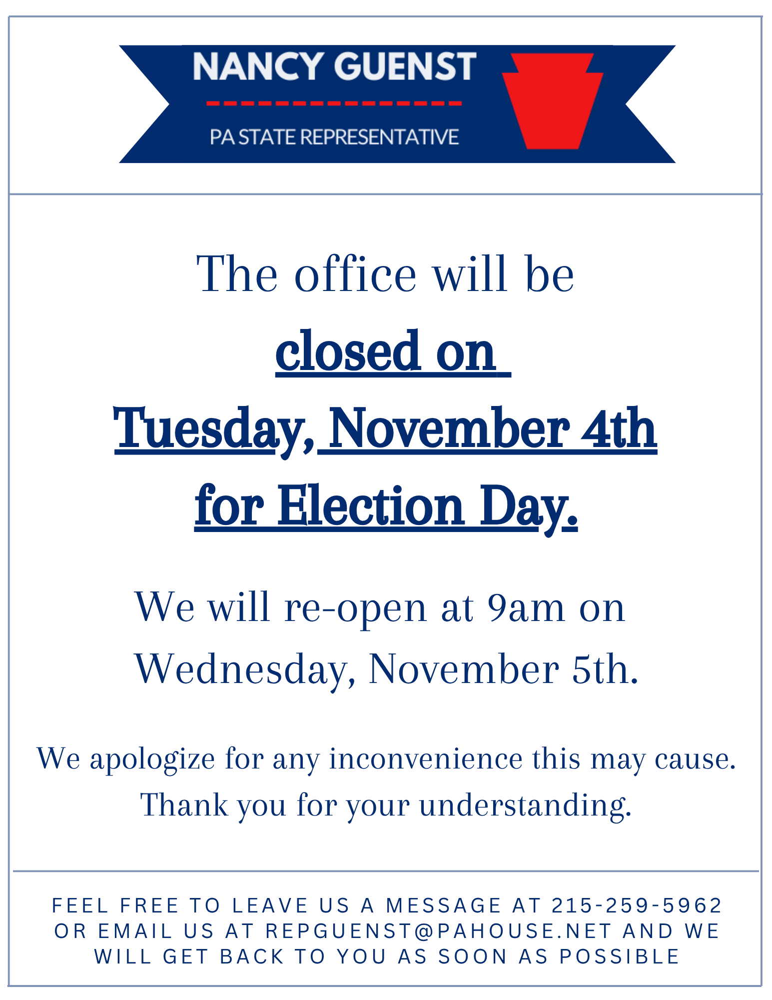 The office will be closed next Tuesday, November 4th, for Election Day.