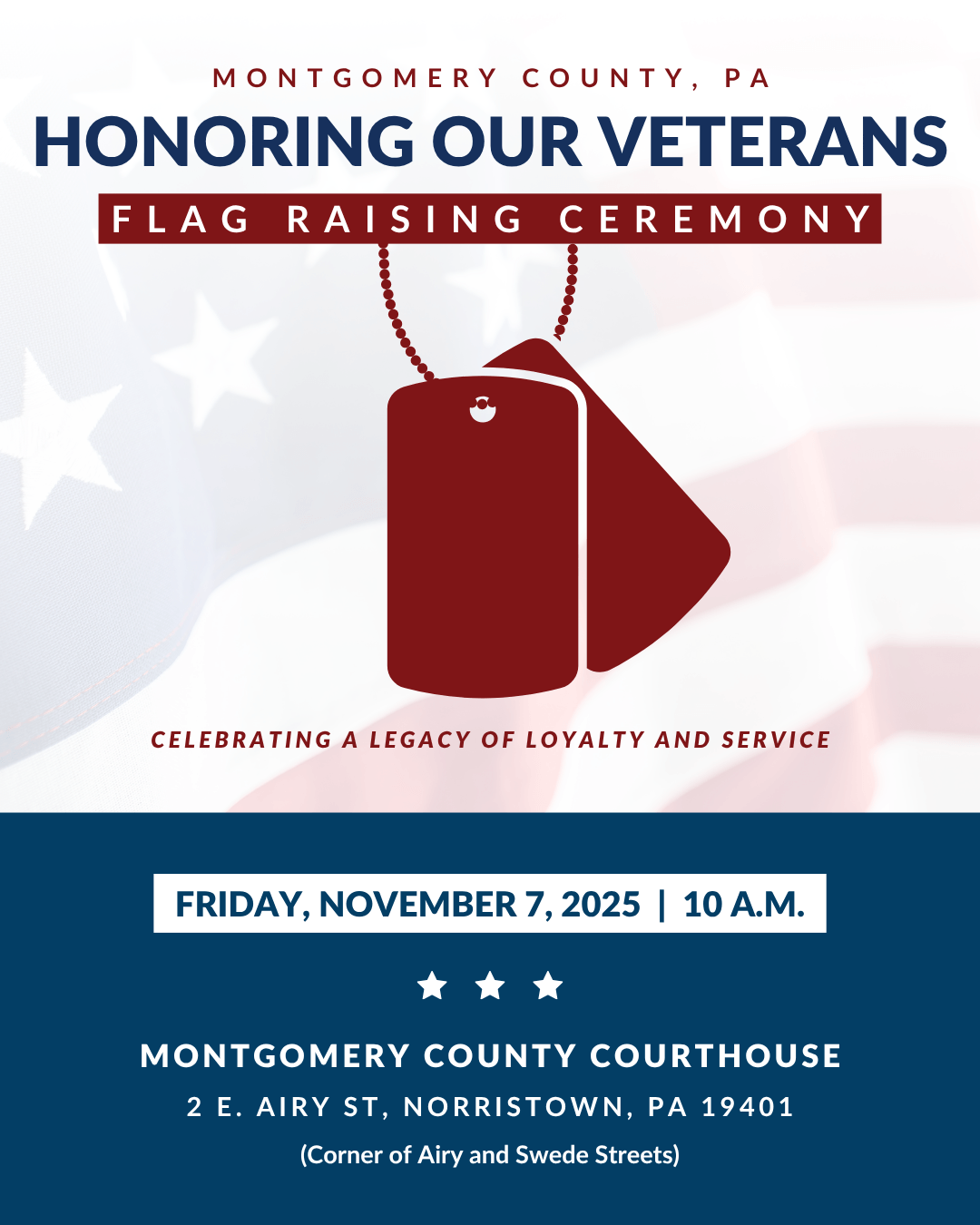 The Montgomery County Commissioners and the Montgomery County Veterans Task Force are holding a Veterans Flag-Raising Ceremony on Friday, November 7th at 10am in Norristown at the