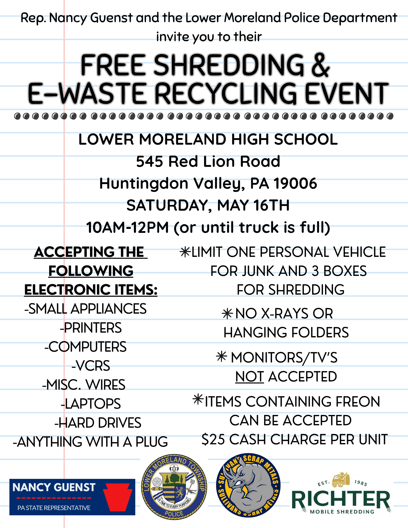 Join us for our Free Shredding and E-Waste Event with the Lower Moreland Police Department on Saturday, May 16th from 10 a.m.-noon. This is a fantastic opportunity to protect your personal information while making a positive impact on your community!