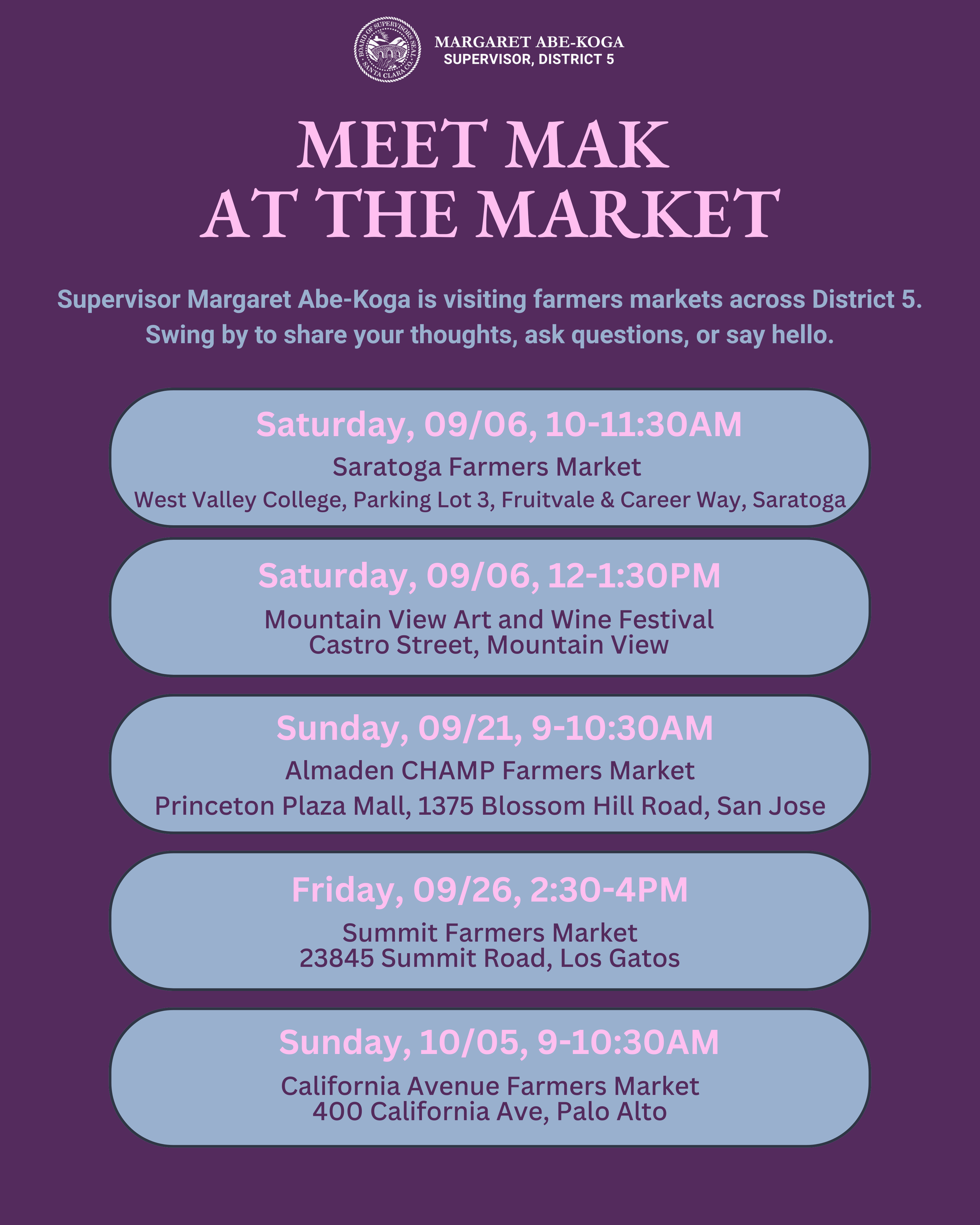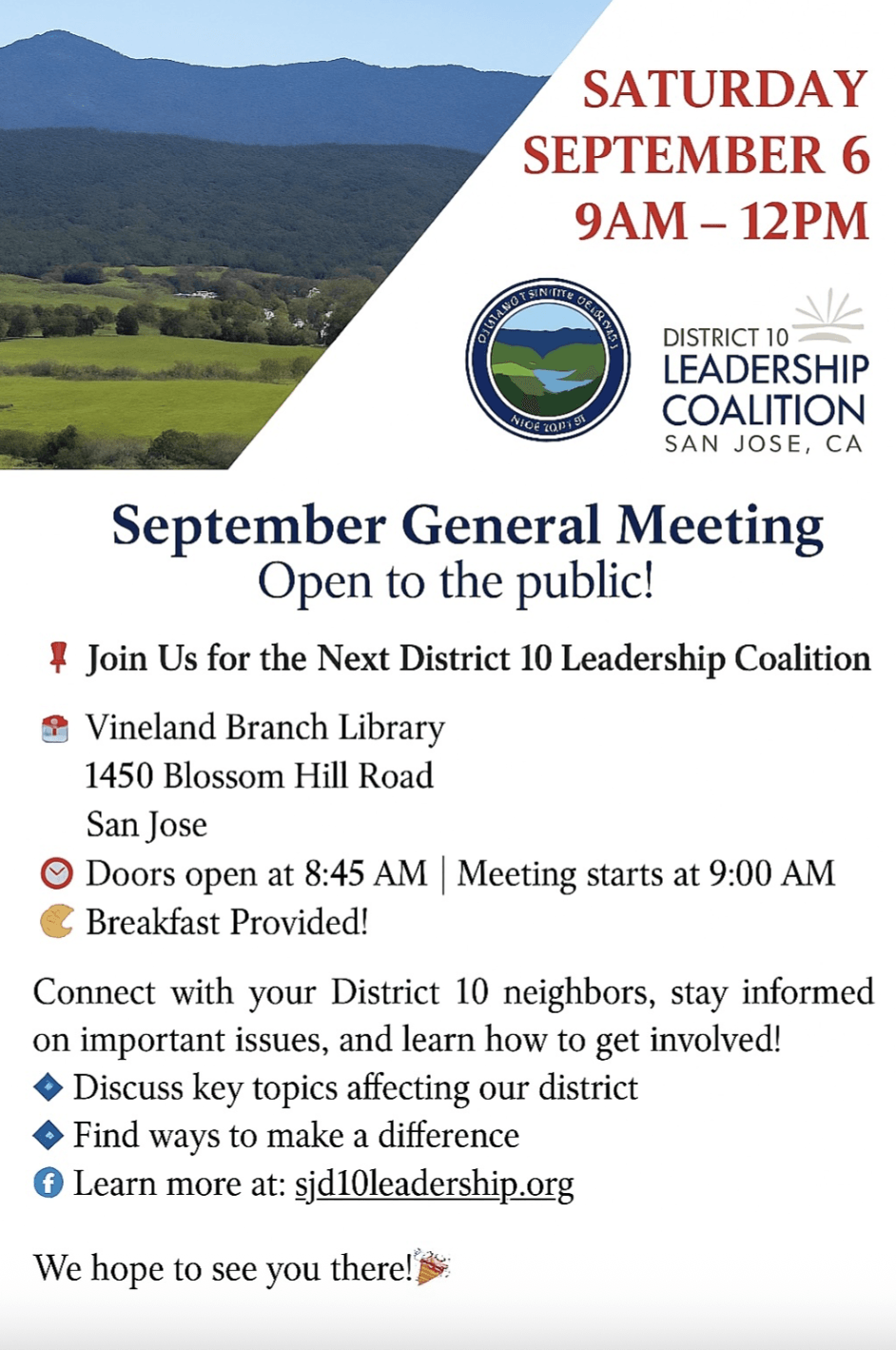 Almaden Valley residents are invited to the District 10 Leadership Coalition meeting, where I’ll share updates from recent Board of Supervisors meetings, highlight initiatives I’m leading in District Five, and answer your questions about how County government works and how we can address everyday challenges together.