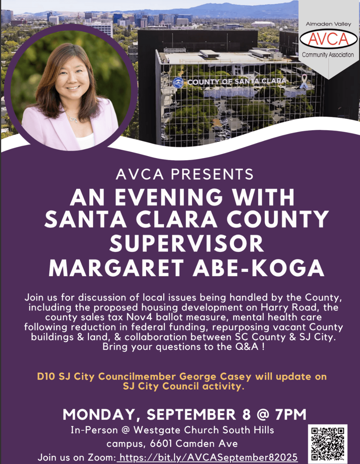 I will join the Almaden Valley Community Association on Monday, September 8, at Westgate Church South Hills Campus at 7PM to share county updates, answer questions, and hear directly from residents.