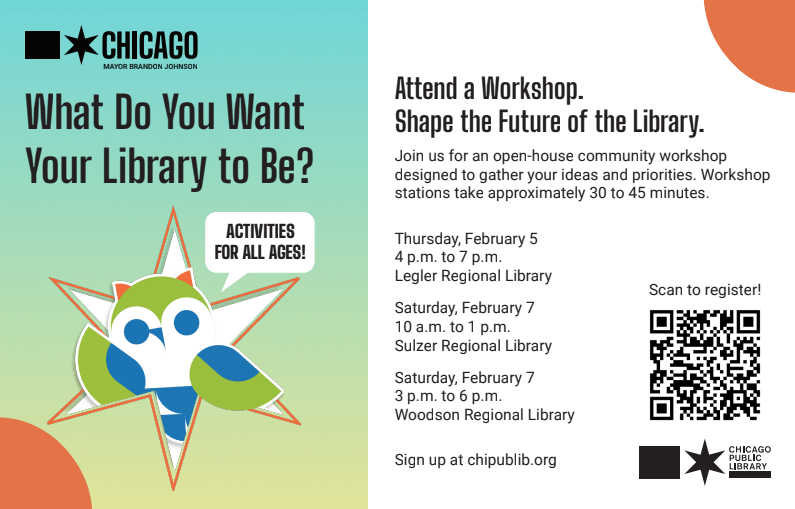 Chicago Public Library invites you to join in on a Patron Workshop to ensure that the future of CPL reflects our community’s needs and aspirations! Workshops are available at three locations: Legler Regional Library, Sulzer Regional Library, and Woodson Regional Library.