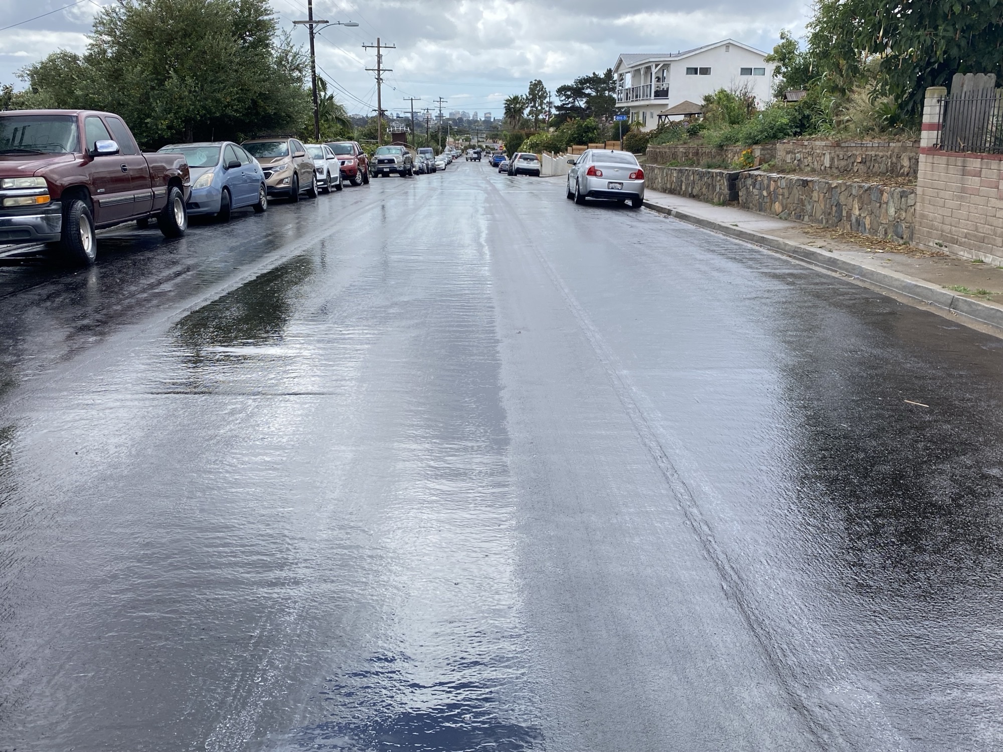 After a morning rain in Linda Vista, puddles sat on top of freshly slurry-sealed streets—exactly what we want to see! That protective layer keeps water from seeping below the surface, where it can lead to potholes and costly damage.