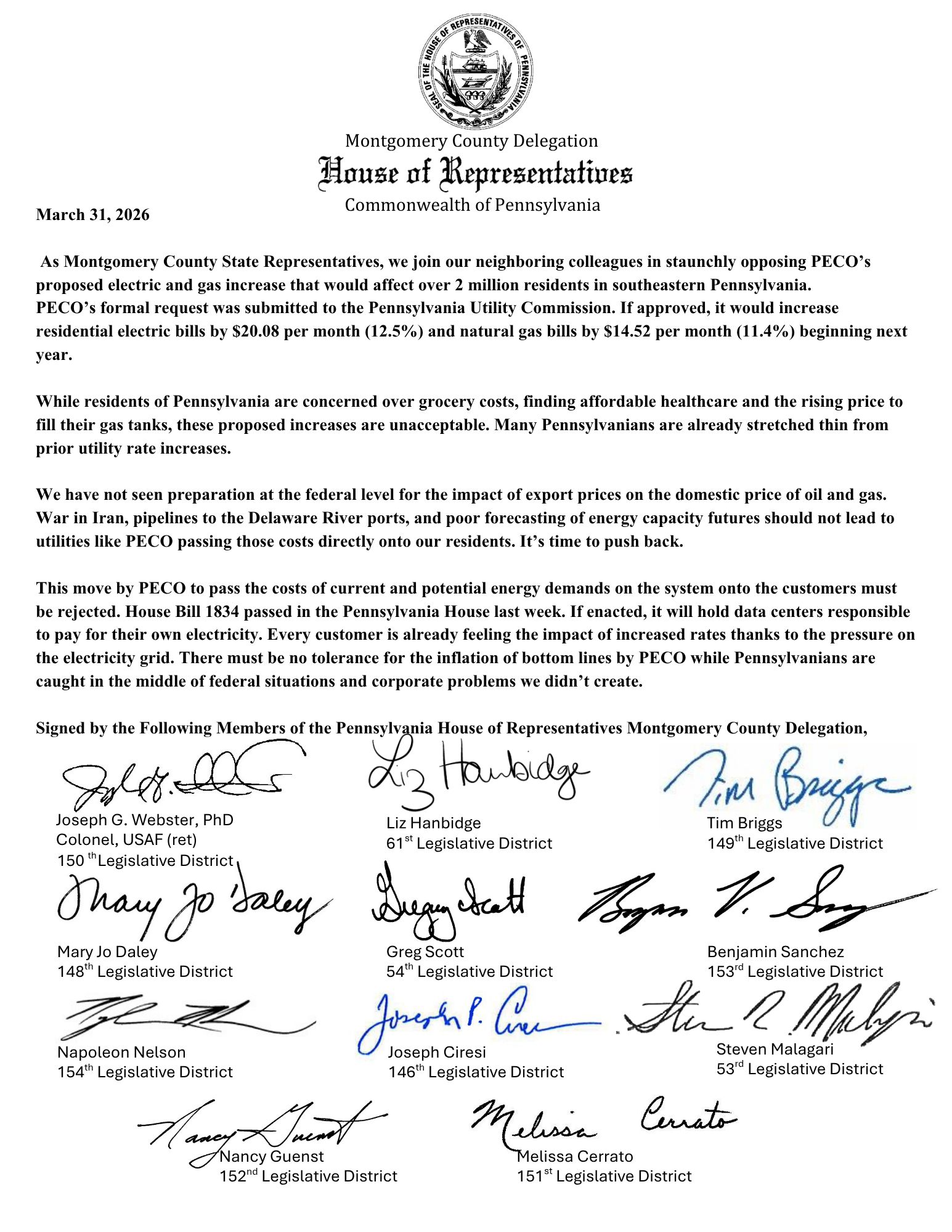 I have joined my colleagues in the Montgomery County Delegation of the Pennsylvania House of Representatives to formally oppose the proposed electric and gas rate increases requested by PECO Energy Company.