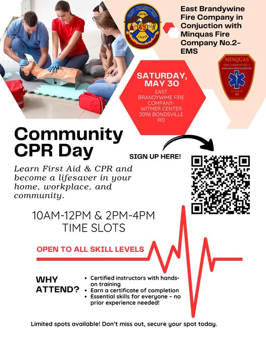 The East Brandywine Fire Company and Minquas Fire Company No. 2 are partnering to offer hands-on CPR & First Aid Training to community members on Saturday, May 30. Trainings will be held at the Witmer Center at East Brandywine Fire Company, with two time slots to choose from.