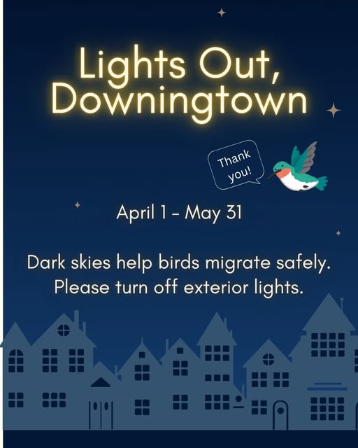 The beginning of April means the beginning of peak spring migration for migratory birds, as our feathered friends return from warmer climates. Please help them find their way home by turning off exterior lights as much as possible, especially during the spring migration period, April 1 through May 31.