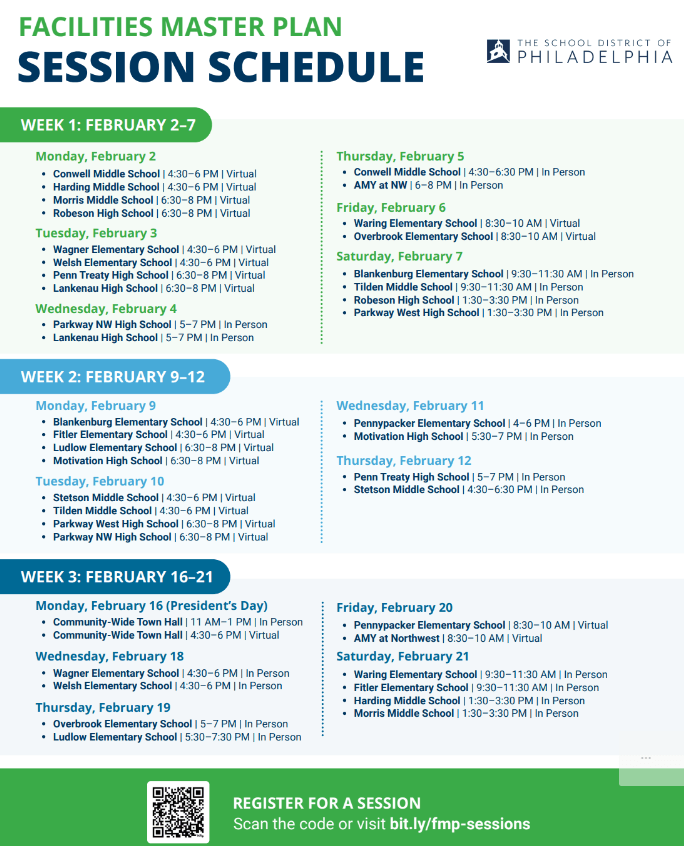 The Philadelphia School District will host a series of community engagement sessions throughout the month of February to discuss the Facilities Master Plan.